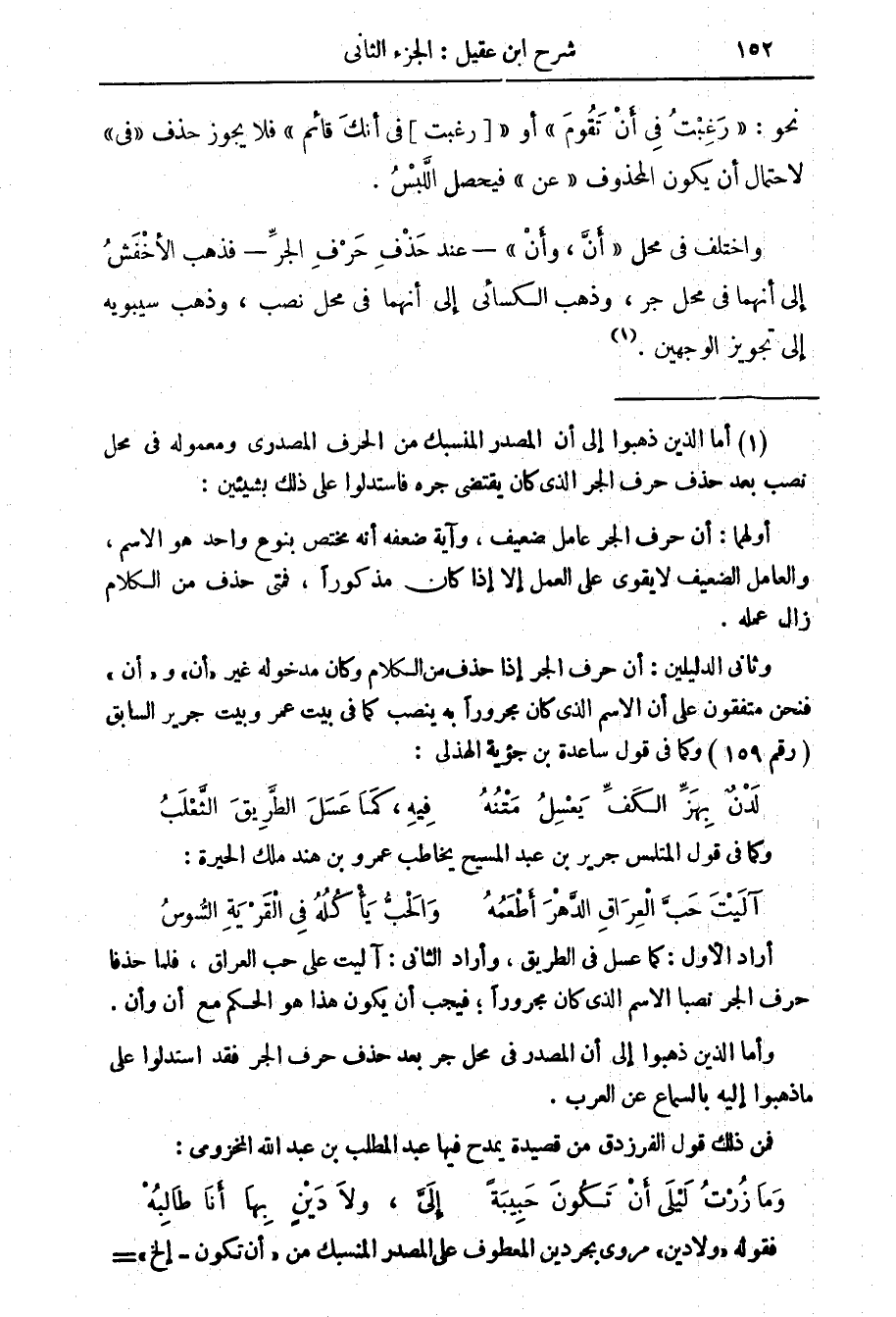 وثاني الدليلين: أن حرف الجر إذا حذف من الكلام وكان مدخوله غير " أن " و" أن " فنحن متفقون على أن الاسم الذي كان مجرورا به ينصب كما في بيت عمر وبيت جرير السابق (رقم 159) وكما في قول ساعدة بن جؤية الهذلي: لدن بهز الكف يعسل متنه فيه، كما عسل الطريق الثعلب وكما في قول المتلمس جرير بن عبد المسيح يخاطب عمرو بن هند ملك الحيرة: آليت حب العراق الدهر أطعمه والحب يأكله في القرية السوس أراد الاول: كما عسل في الطريق، وأراد الثاني: آليت على حب العراق، فلما حذفا حرف الجر نصبا الاسم الذي كان مجرورا، فيجب أن يكون هذا هو الحكم مع أن وأن.