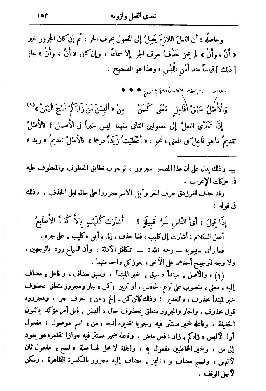 (1) " والاصل " مبتدأ " سبق " خبر المبتدأ، وسبق مضاف، و" فاعل " مضاف إليه " معنى " منصوب على نزع الخافض، أو تمييز " كمن " جار ومجرور متعلق بمحذوف خبر لمبتدأ محذوف، والتقدير: وذلك كائن كمن - إلخ " من " حرف جر، ومجروره قول محذوف، والجار والمجرور متعلق بمحذوف حال " ألسن " فعل أمر مؤكد بالنون الخفيفة، وفاعله ضمير مستتر فيه وجوبا تقديره أنت " من " اسم موصول: مفعول أول لالبس " زاركم " زار: فعل ماض، وفاعله ضمير مستتر فيه جوازا تقديره هو يعود إلى من، وضمير المخاطبين مفعول به، والجملة لا محل لها صلة " نسج " مفعول ثان لالبس، ونسج مضاف و" اليمن " مضاف إليه مجرور بالكسرة الظاهرة، وسكن لاجل الوقف.