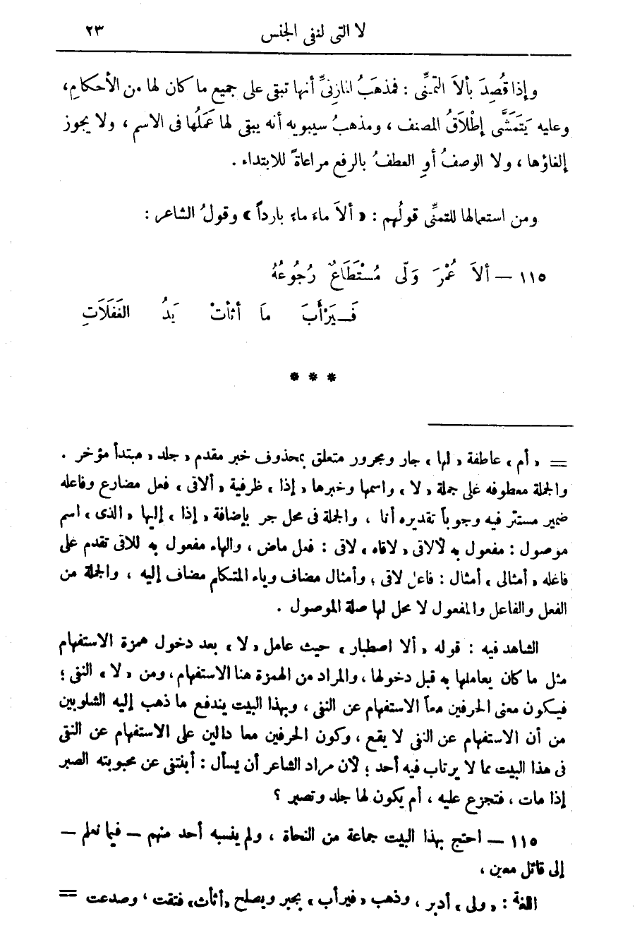 الشاهد فيه: قوله " ألا اصطبار " حيث عامل " لا " بعدد دخول همزة الاستفهام مثل ما كان يعاملها به قبل دخولها، والمراد من الهمزة هنا الاستفهام، ومن " لا " النفي، فيكون معنى الحرفين معا الاستفهام عن النفي، وبهذا البيت يندفع ما ذهب إليه الشلوبين من أن الاستفهام عن النفي لا يقع، وكون الحرفين (معا) ؟ دالين على الاستفهام عن النفي في هذا البيت مما لا يرتاب فيه أحد، لان مراد الشاعر أن يسأل: أينتفي عن محبوبته الصبر إذا مات، فتجزع عليه، أم يكون لها جلد وتصبر؟ 115 - احتج بهذا البيت جماعة من النحاة ولم ينسبه أحد منهم - فيما نعلم - إلى قائل معين.