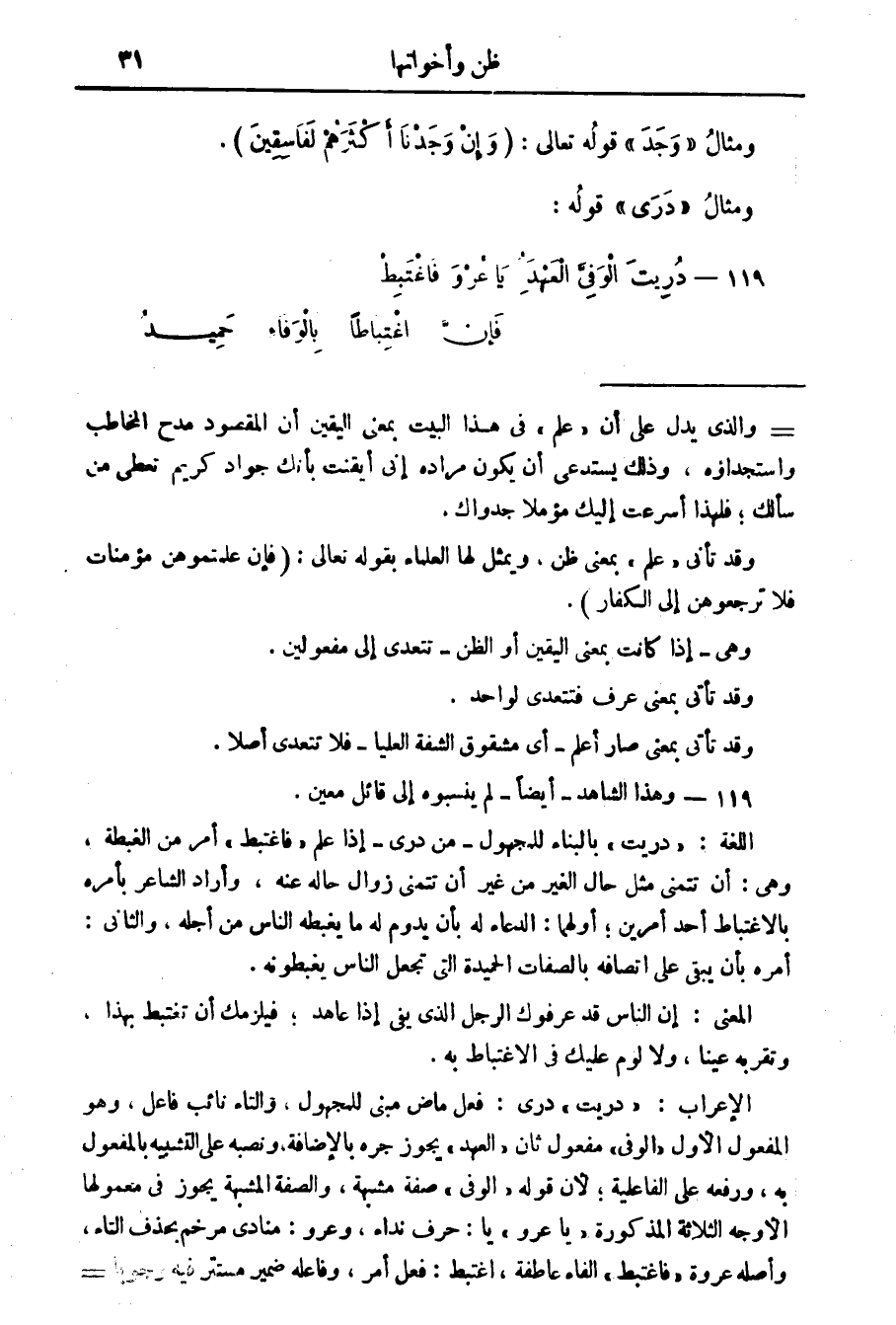 = والذي يدل على أن " علم " في هذا البيت بمعنى اليقين أن المقصود مدح المخاطب واستجداؤه، وذلك يستدعي أن يكون مراده إني أيقنت بأنك جواد كريم تعطي من سألك، فلهذا أسرعت إليك مؤملا جدواك.