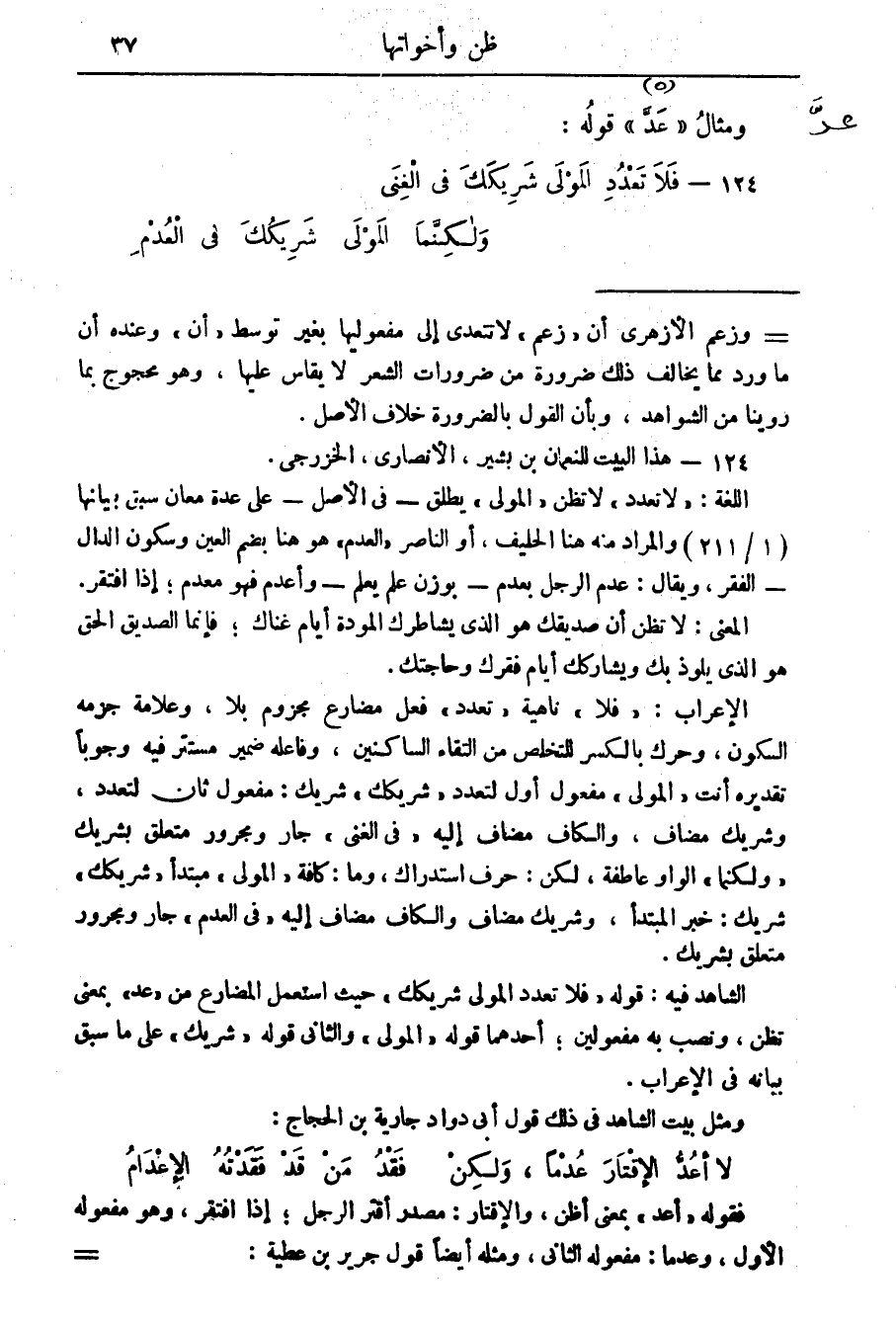 الشاهد فيه: قوله " فلا تعدد المولى شريكك " حيث استعمل المضارع من " عد " بمعنى تظن، ونصب به مفعولين، أحدهما قوله " المولى " والثاني قوله " شريك " على ما سبق بيانه في الاعراب.