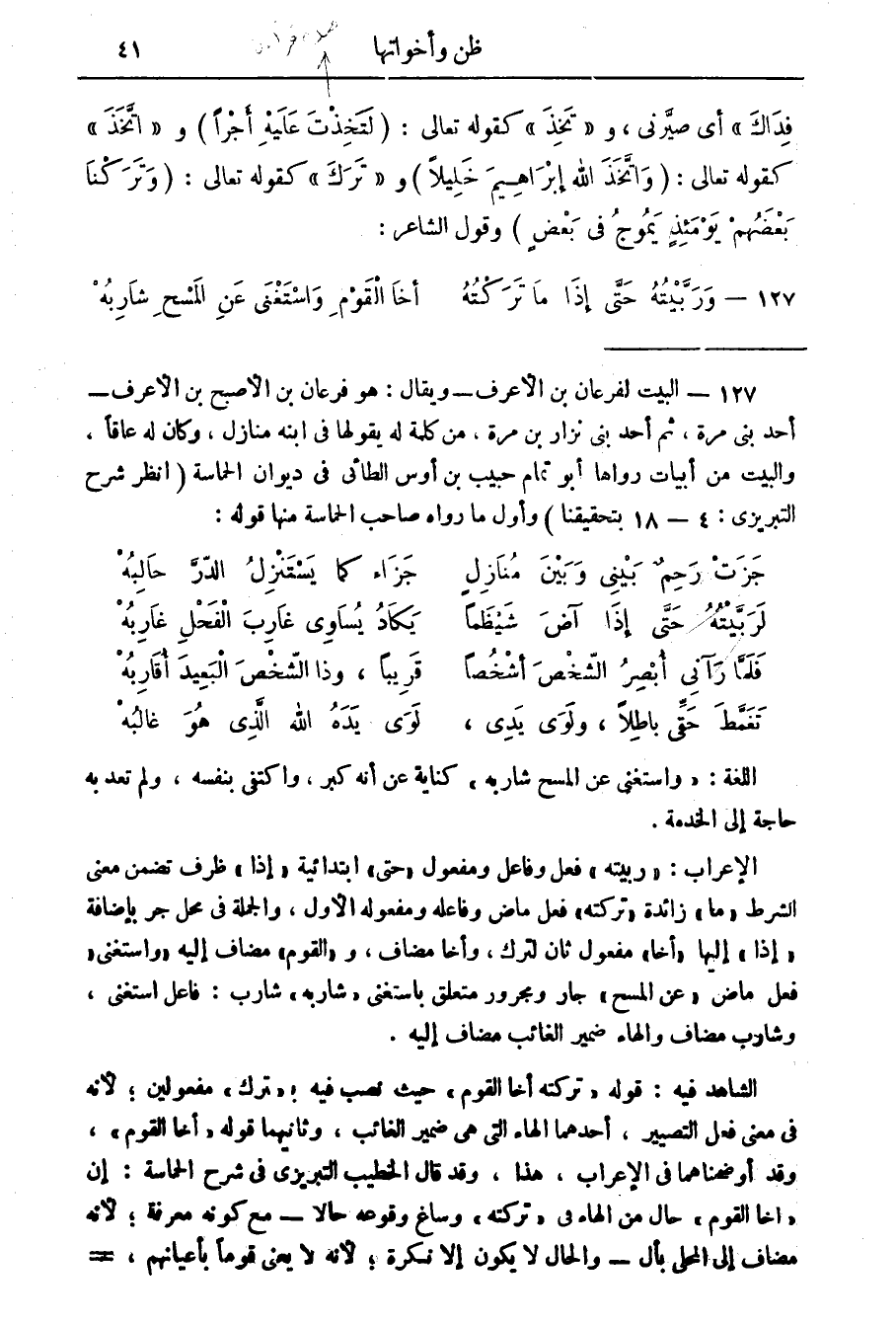 الشاهد فيه: قوله " تركته أخا القوم " حيث نصب فيه ب " ترك " مفعولين، لانه في معنى فعل التصيير، أحدهما الهاء التي هي ضمير الغائب، وثانيهما قوله " أخا القوم "، وقد أوضحناهما في الاعراب، هذا، وقد قال الخطيب التبريزي في شرح الحماسة: إن " أخا القوم " حال من الهاء في " تركته " وساغ وقوعه حالا مع كونه معرفة، لانه مضاف إلى المحلى بأل والحال لا يكون إلا نكرة، لانه لا يعني قوما بأعيانهم، ولا =