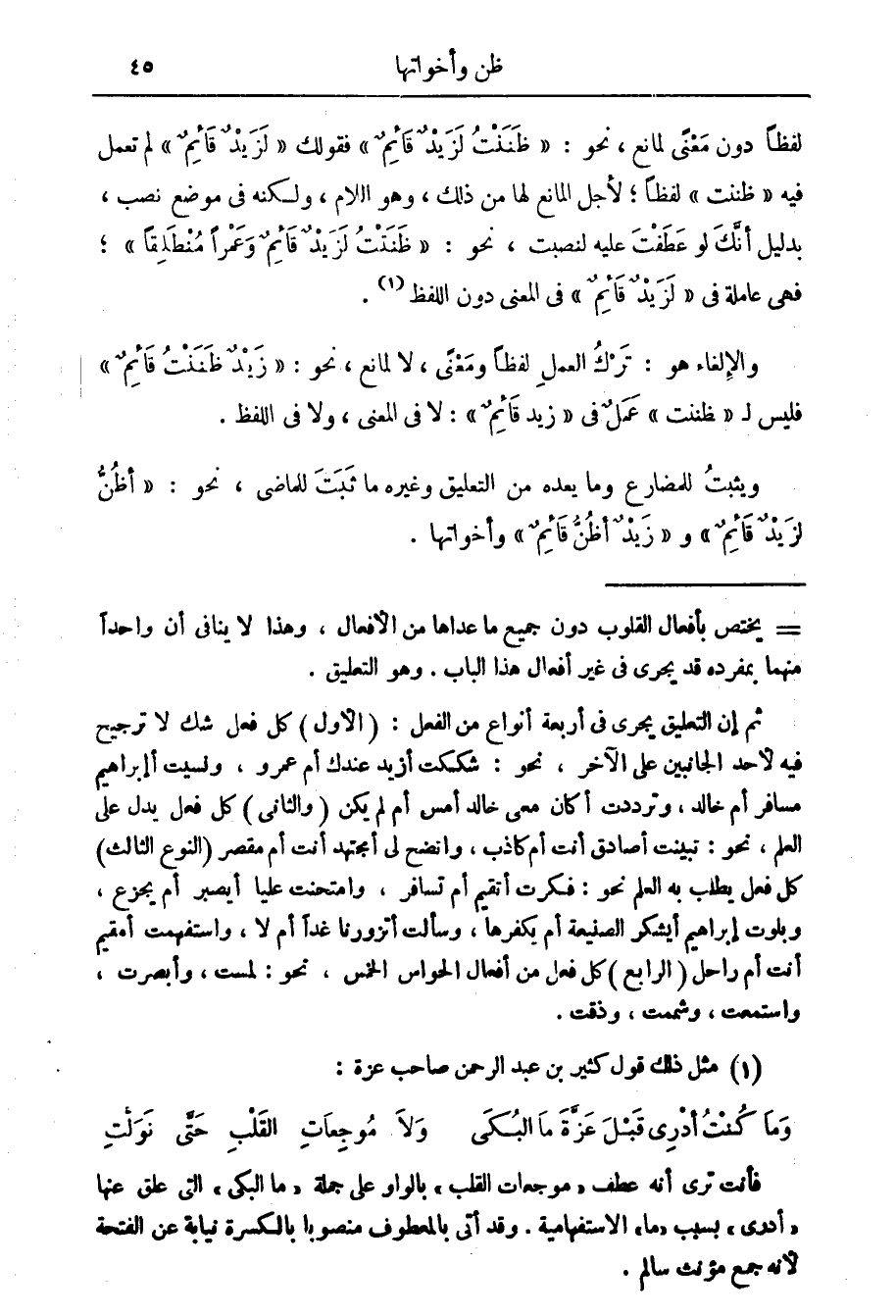 (1) مثل ذلك قول كثير بن عبد الرحمن صاحب عزة: وما كنت أدري قبل عزة ما البكى ولا موجعات القلب حتى نولت فأنت ترى أنه عطف " موجعات القلب " بالواو على جملة " ما البكى " التي علق عنها " أدري " بسبب " ما " الاستفهامية.