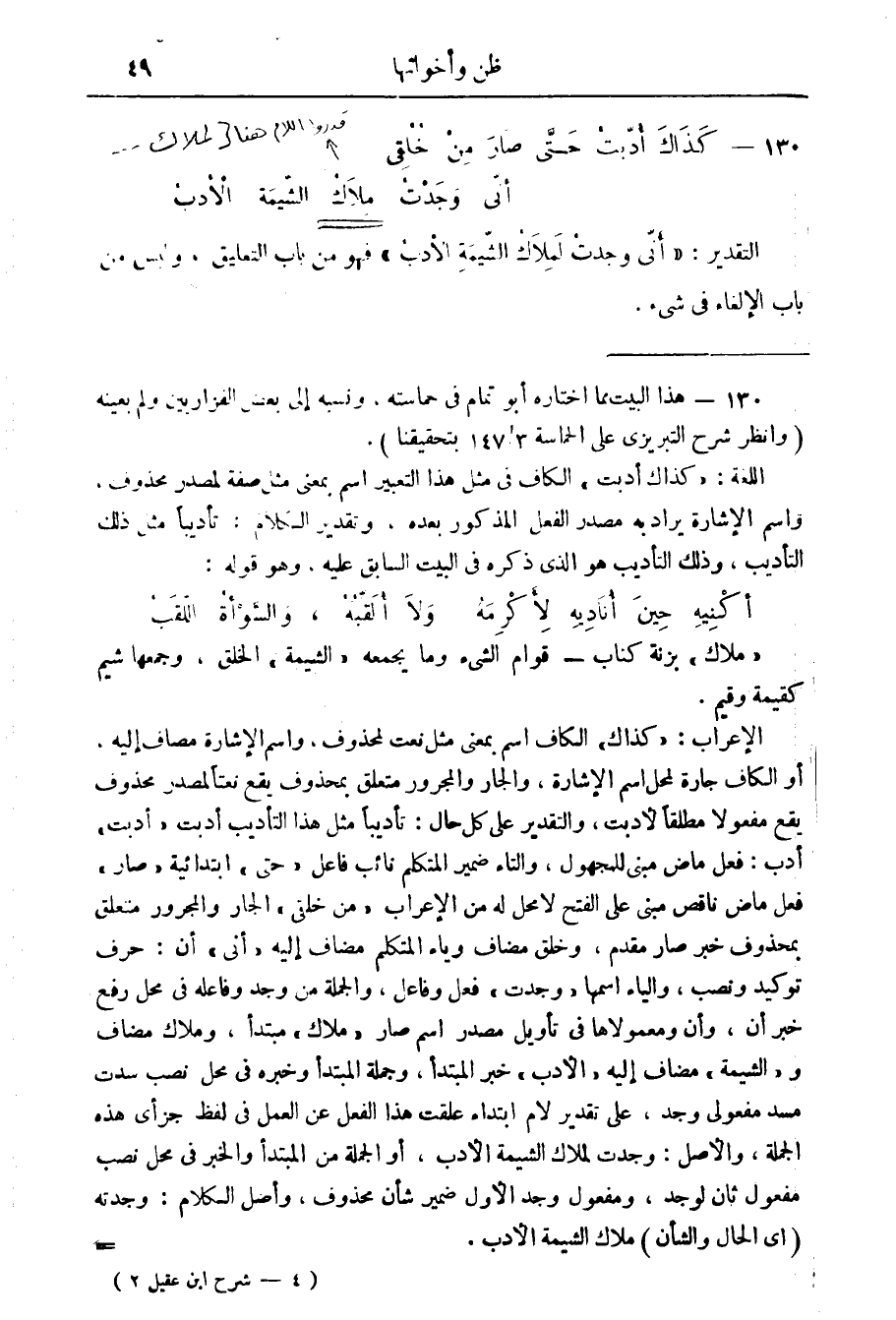 الاعراب: " كذاك " الكاف اسم بمعنى مثل نعت لمحذوف، واسم الاشارة مضاف إليه، أو الكاف جارة لمحل اسم الاشارة، والجار والمجرور متعلق بمحذوف يقع نعتا لمصدر محذوف يقع مفعولا مطلقا لادبت، والتقدير على كل حال: تأديبا مثل هذا التأديب أدبت " أدبت " أدب: فعل ماض مبني للمجهول، والتاء ضمير المتكلم نائب فاعل " حتى " ابتدائية " صار " فعل ماض ناقص " من خلقي " الجار والمجرور متعلق بمحذوف خبر صار مقدم، وخلق مضاف وياء المتكلم مضاف إليه " أني " أن: حرف توكيد ونصب، والياء اسمها " وجدت " فعل وفاعل، والجملة من وجد وفاعله في محل رفع خبر أن، وأن ومعمولاها في تأويل مصدر اسم صار " ملاك " مبتدأ، وملاك مضاف و" الشيمة " مضاف إليه " الادب " خبر المبتدأ، وجملة المبتدأ وخبره في محل نصب سدت مسد مفعولي وجد، على تقدير لام ابتداء علقت هذا الفعل عن العمل في لفظ جزأى هذه الجملة، والاصل: وجدت لملاك الشيمة الادب، أو الجملة في محل نصب مفعول ثان لوجد، ومفعوله الاول ضمير شأن محذوف، وأصل الكلام: وجدته (أي الحال والشأن) ملاك الشيمة الادب.