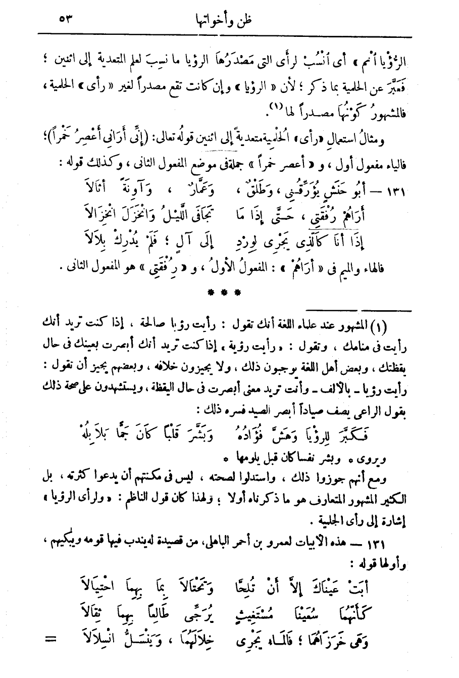ومثال استعمال رأى الحلمية متعدية إلى اثنين قوله تعالى: {إِنِّي أَرَانِي أَعْصِرُ خَمْراً} فالياء مفعول أول وأعصر خمرا جملة في موضع المفعول الثاني وكذلك قوله: