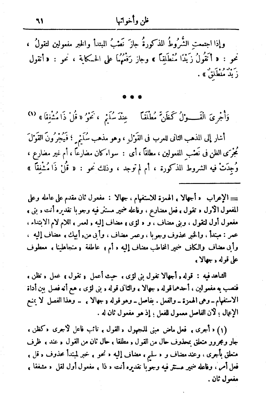 (1) " أجرى " فعل ماض مبني للمجهول " القول " نائب فاعل لاجرى " كظن " جار ومجرور متعلق بمحذوف حال من القول " مطلقا " حال ثان من القول " عند " ظرف متعلق بأجرى، وعند مضاف و" سليم " مضاف إليه " نحو " خبر لمبتدأ محذوف