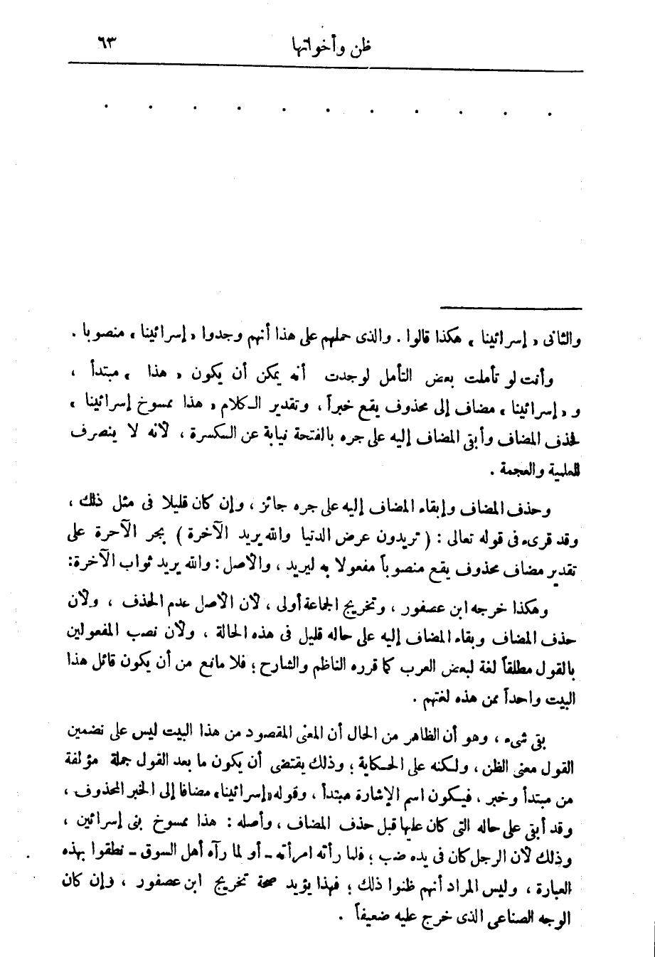 وأنت لو تأملت بعض التأمل لوجدت أنه يمكن أن يكون " هذا " مبتدأ، " إسرائينا " مضاف إلى محذوف يقع خبرا، وتقدير الكلام " هذا ممسوخ إسرائينا " فحذف المضاف وأبقى المضاف إليه على جره بالفتحة نيابة عن الكسرة، لانه لا ينصرف للعلمية والعجمة.