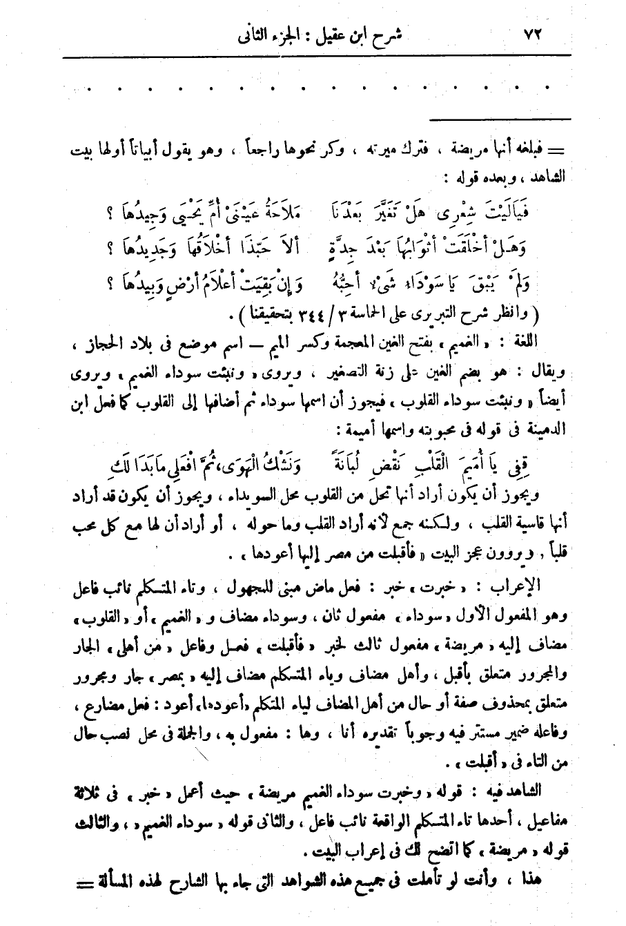 فيا ليت شعري هل تغير بعدنا ملاحة عيني أم يحيى وجيدها؟ وهل أخلقت أثوابها بعد جدة ألا حبذا أخلاقها وجديدها؟ ولم يبق يا سوداء شئ أحبه وإن بقيت أعلام أرض وبيدها (وانظر شرح التبريزي على الحماسة 3 / 344 بتحقيقنا) ، اللغة: " الغميم " بفتح الغين المعجمة وكسر الميم - اسم موضع في بلاد الحجاز، ويقال: هو بضم الغين على زنة التصغير، ويروى " ونبئت سوداء الغميم " ويروى أيضا " ونبئت سوداء القلوب " فيجوز أن اسمها سوداء ثم أضافها إلى القلوب كما فعل ابن الدمينة في قوله: قفي يا أميم القلب نقض لبانة ونشك الهوى، ثم افعلي ما بدا لك ويجوز أن يكون أراد أنها تحل من القلوب محل السويداء، ويجوز أن يكون قد أراد أنها قاسية القلب، ولكنه جمع لانه أراد القلب وما حوله، أو أراد أن لها مع كل محب قلبا، ويروون عجز البيت " فأقبلت من مصر إليها أعودها "، الاعراب: " خبرت " خبر: فعل ماض مبني للمجهول، وتاء المتكلم نائب فاعل وهو المفعول الاول " سوداء " مفعول ثان، وسوداء مضاف و" الغميم " مضاف إليه " مريضة " مفعول ثالث لخبر " فأقبلت " فعل وفاعل " من أهلي " الجار والمجرور متعلق بأقبل، وأهل مضاف وياء المتكلم مضاف إليه " بمصر " جار ومجرور متعلق بمحذوف صفة أو حال من أهل المضاف لياء المتكلم " أعودها " أعود: فعل مضارع، وفاعله ضمير مستتر فيه وجوبا تقديره أنا، وهاء: مفعول به، والجملة في محل نصب حال من التاء في " أقبلت ".