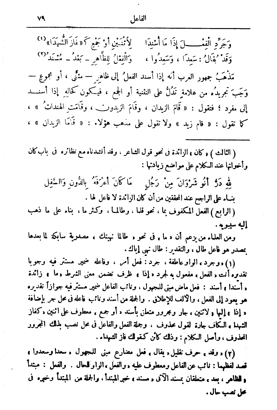 مذهب جمهور العرب أنه إذا أسند الفعل إلى ظاهر مثنى أو مجموع وجب تجريده من علامة تدل على التثنية أو الجمع فيكون كحاله إذا أسند إلى مفرد فتقول قام الزيدان وقام الزيدون وقامت الهندات كما تقول قام زيد ولا تقول على مذهب هؤلاء: قاما الزيدان