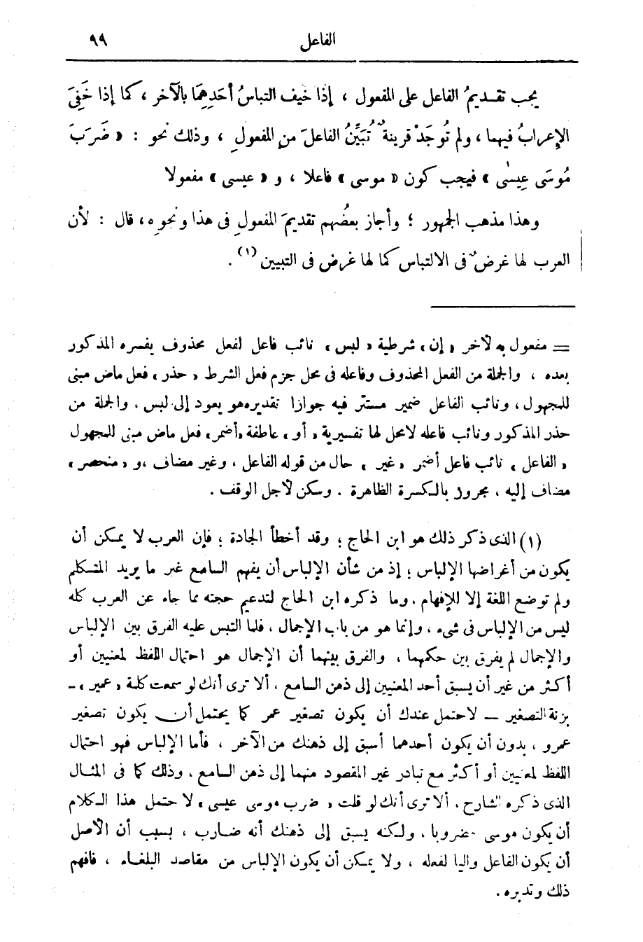(1) الذي ذكر ذلك هو ابن الحاج، وقد أخطأ الجادة، فإن العرب لا يمكن أن يكون من أغراضها الالباس، إذ من شأن الالباس أن يفهم السامع غير ما يريد المتكلم ولم توضع اللغة إلا للافهام، وما ذكره ابن الحاج لتدعيم حجته مما جاء عن العرب كله ليس من الالباس في شئ، وإنما هو من باب الاجمال، فلما التبس عليه الفرق بين الالباس والاجمال لم يفرق بين حكمهما، والفرق بينهما أن الاجمال هو احتمال اللفظ لمعنيين أو أكثر من غير أن يسبق أحد المعنيين إلى ذهن السامع، ألا ترى أنك لو سمعت كلمة " عمير " - بزنة التصغير - لاحتمل عندك أن يكون تصغير عمر كما يحتمل أن يكون تصغير عمرو، بدون أن يكون أحدهما أسبق إلى ذهنك من الآخر، فأما الالباس فهو احتمال اللفظ لمعنيين أو أكثر مع تبادر غير المقصود منهما إلى ذهن السامع، وذلك كما في المثال الذي ذكره الشارح، ألا ترى أنك لو قلت " ضرب موسى عيسى " لاحتمل هذا الكلام أن يكون موسى مضروبا ولكنه يسبق إلى ذهنك أنه ضارب، بسبب أن الاصل أن يكون الفاعل واليا لفعله، ولا يمكن أن يكون هذا من مقاصد البلغاء، فافهم ذلك وتدبره.