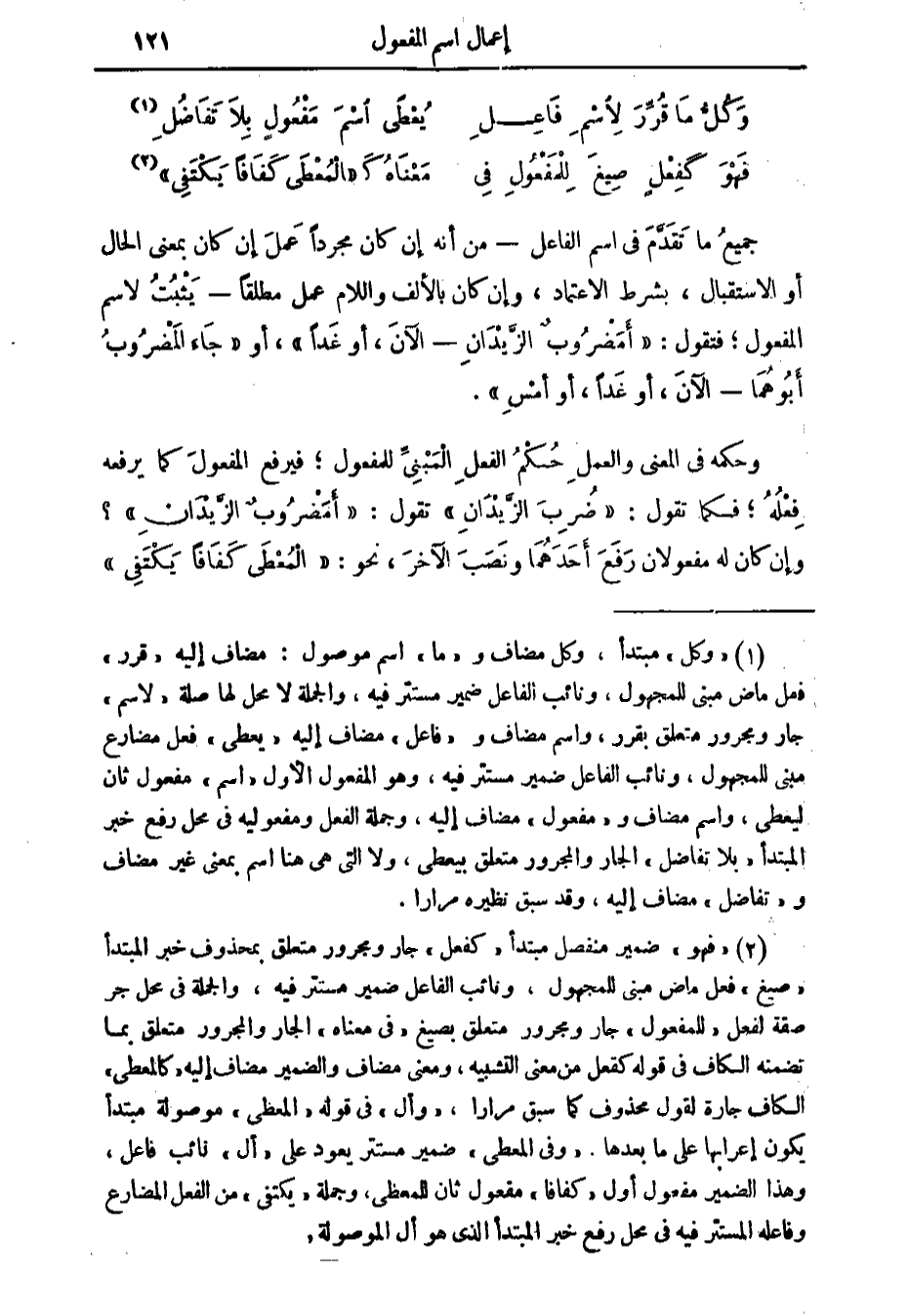 جميع ما تقدم في اسم الفاعل من أنه إن كان مجردا عمل إن كان بمعنى الحال أو الاستقبال بشرط الاعتماد وإن كان بالألف واللام عمل مطلقا يثبت لاسم المفعول فتقول أمضروب الزيدان الآن أو غدا أو جاء المضروب أبوهما الآن أو غدا أو أمس وحكمه في المعنى والعمل حكم الفعل المبني للمفعول فيرفع المفعول كما يرفعه فعله فكما تقول ضرب الزيدان تقول أمضروب الزيدان وإن كان له مفعولان رفع أحدهما ونصب الآخر نحو: المعطى كفافا