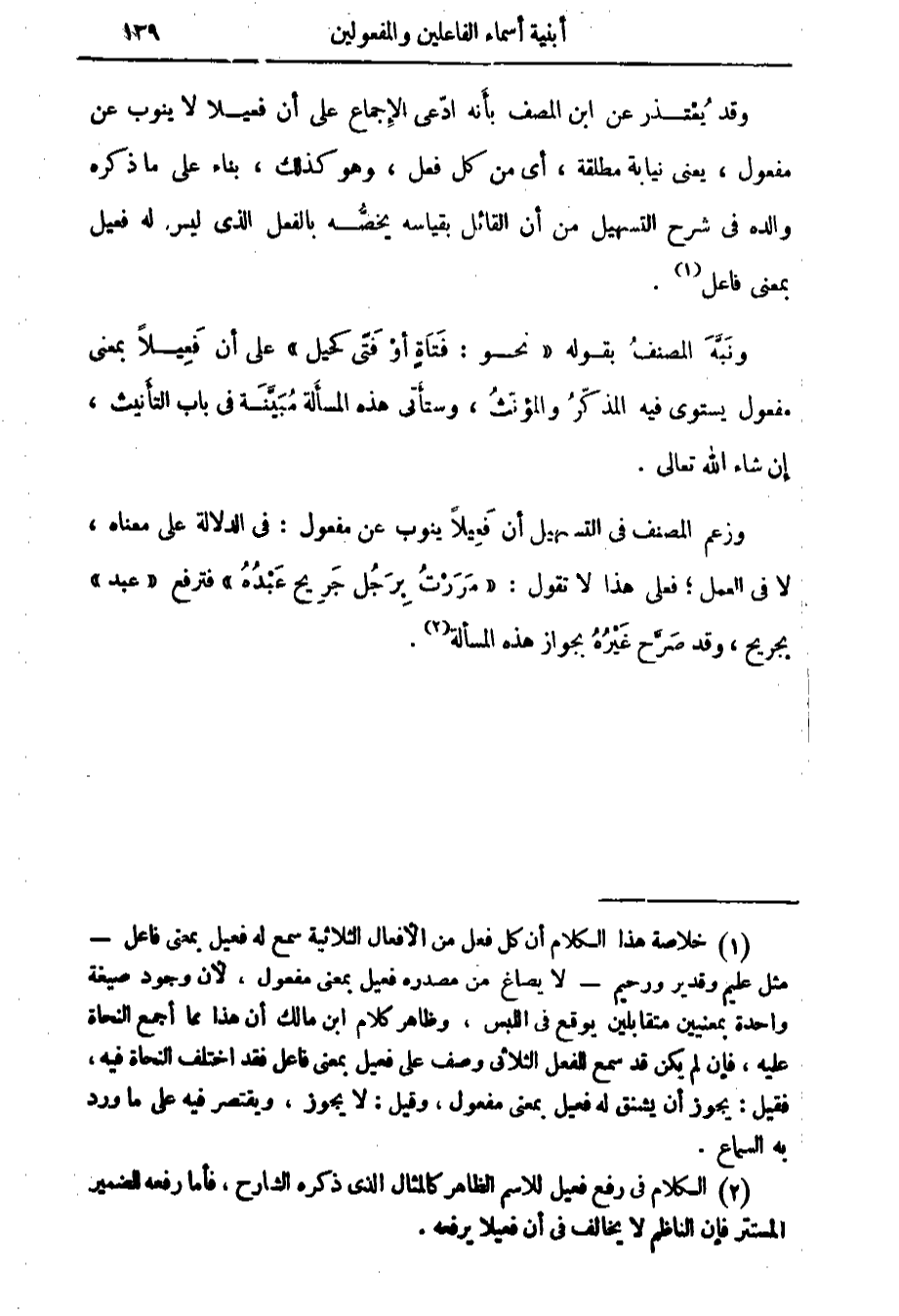 وزعم المصنف في التسهيل أن فعيلا ينوب عن مفعول في الدلالة على معناه لا في العمل فعلى هذا لا تقول مررت برجل جريح عبده فترفع عبد بجريح وقد صرح غيره بجواز هذه المسألة.