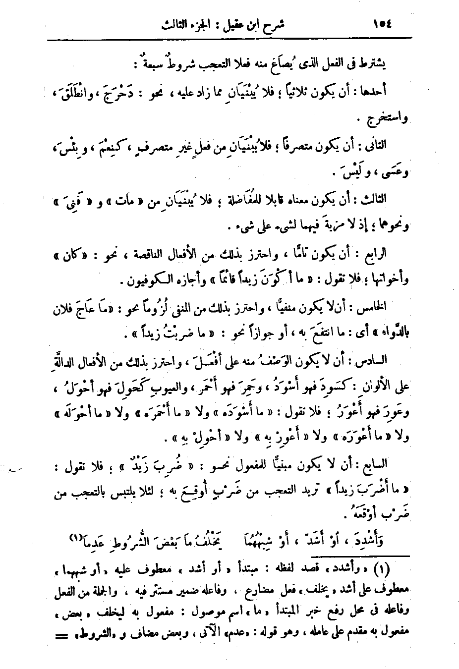 الثالث: أن يكون معناه قابلا للمفاضلة فلا يبنيان من مات وفنى ونحوهما إذ لا مزية فيهما لشيء على شيء الرابع: أن يكون تاما واحترز بذلك من الأفعال الناقصة نحو كان وأخواتها فلا تقول ما أكون زيدا قائما وأجازه الكوفيون