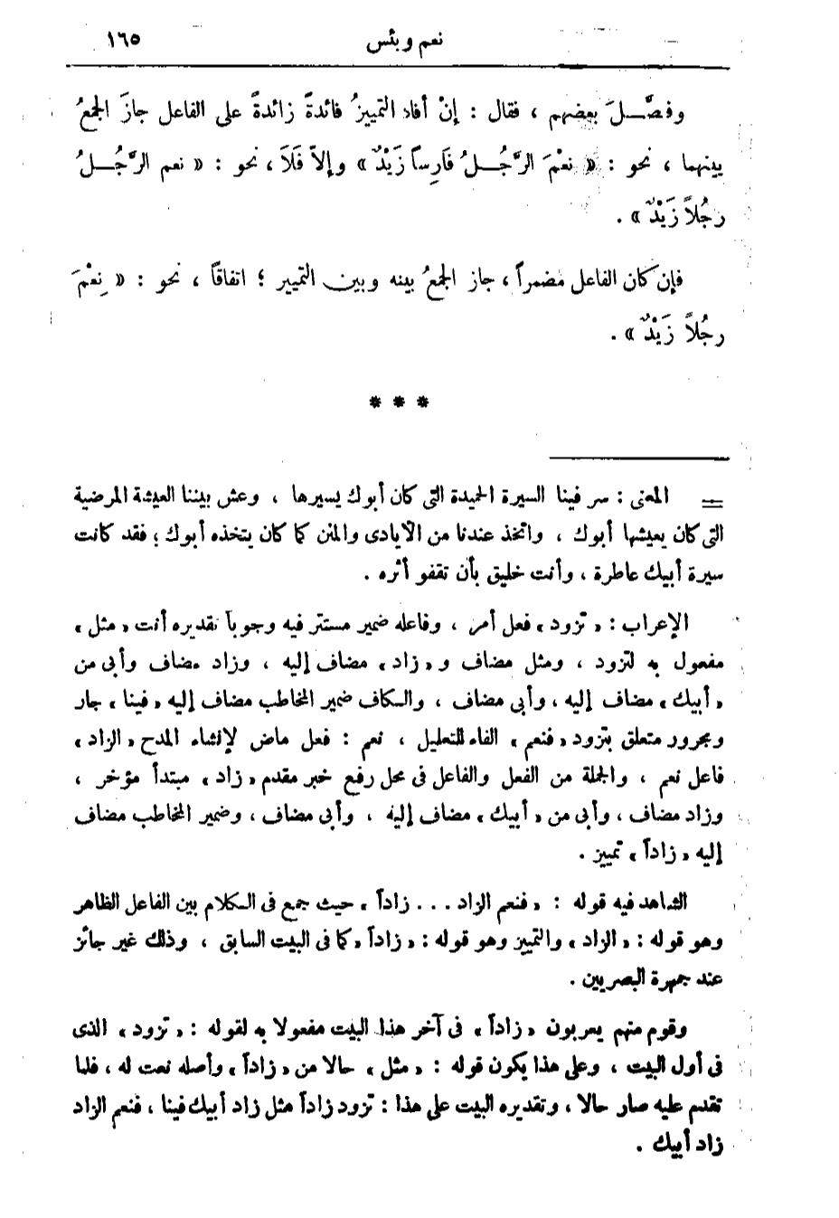 وفصل بعضهم فقال إن أفاد التمييز فائدة زائدة على الفاعل جاز الجمع بينهما نحو نعم الرجل فارسا زيد وإلا فلا نحو نعم الرجل رجلا زيد فإن كان الفاعل مضمرا جاز الجمع بينه وبين التمييز اتفاقا نحو نعم رجلا زيد