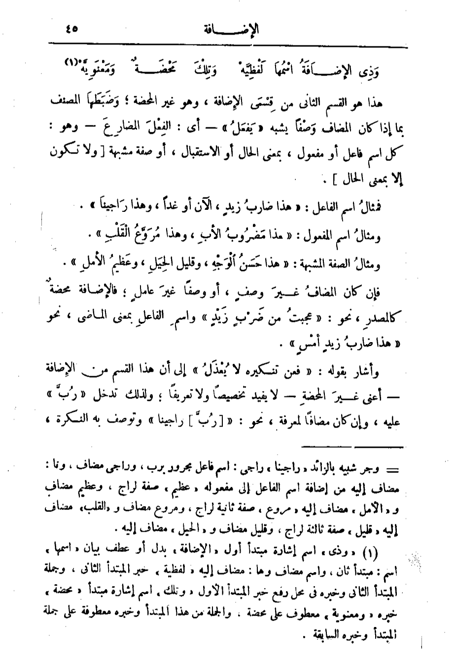 هذا هو القسم الثاني من قسمي الإضافة وهو غير المحضة وضبطها المصنف بما إذا كان المضاف وصفا يشبه يفعل أي الفعل المضارع وهو كل اسم فاعل أو مفعول بمعنى الحال أو الاستقبال أو صفة مشبهة ولا تكون إلا بمعنى الحال فمثال اسم الفاعل هذا ضارب زيد الآن أو غدا وهذا راجينا ومثال اسم المفعول هذا مضروب الأب وهذا مروع القلب ومثال الصفة المشبهة هذا حسن الوجه وقليل الحيل وعظيم الأمل فإن كان المضاف غير وصف أو وصفا غير عامل فالإضافة محضة كالمصدر نحو عجبت من ضرب زيد واسم الفاعل بمعنى الماضي نحو هذا ضارب زيد أمس.