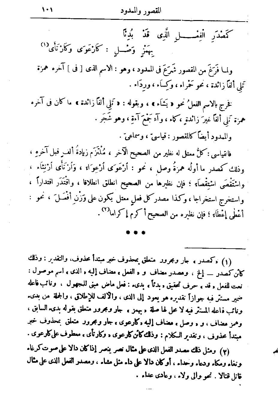 ولما فرغ من المقصور شرع في الممدود وهو الاسم الذي في آخره همزة تلى ألفا زائداة نحو حمراء وكساء ورداء فخرج بالاسم الفعل نحو يشاء وبقوله تلى ألفا زائدة ما كان في آخره همزة تلى ألفا غير زائدة كماء وآء جمع آءة وهو شجر.