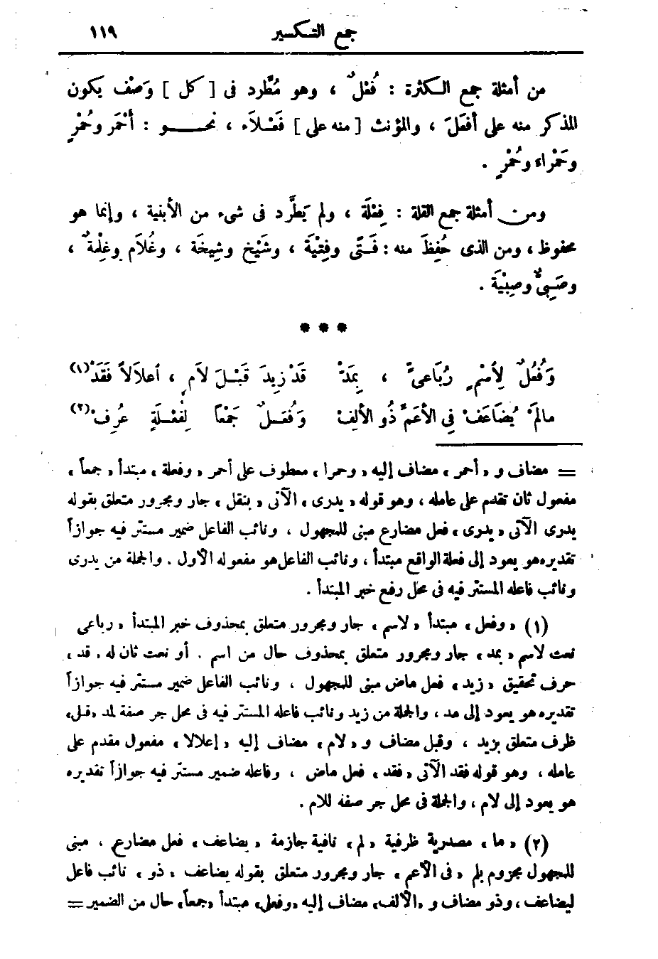 من أمثلة جمع الكثرة فعل وهو مطرد في كل وصف يكون المذكر منه على أفعل والمؤنث منه على فعلاء نحو أحمر وحمر وحمراء وحمر.