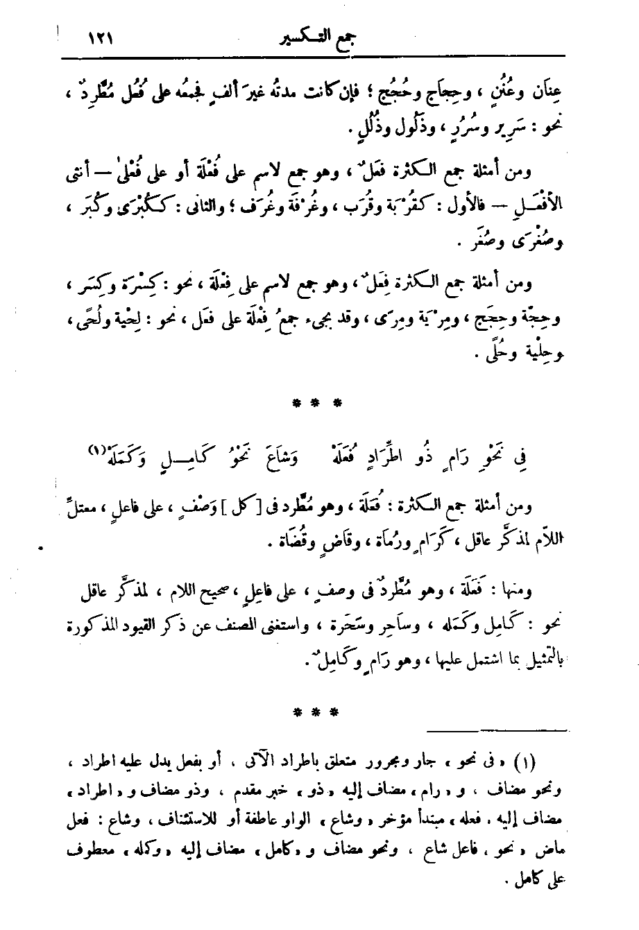 والثاني ككبرى وكبر وصغرى وصغر ومن أمثلة جمع الكثرة فعل وهو جمع لاسم على فعلة نحو كسرة وكسر وحجة وحجج ومرية ومرى وقد يجيء جمع فعلة على فعل نحو لحية ولحى وحيلة وحلى.