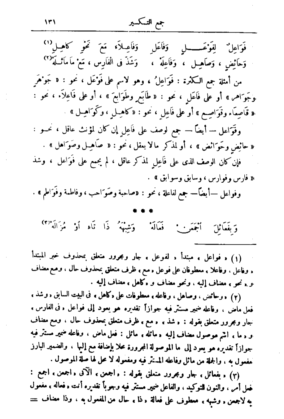 من أمثلة جمع الكثرة فواعل وهو لاسم على فوعل نحو جوهر وجواهر أو على فاعل نحو طابع وطوابع أو على فاعلاء نحو قاصعاء وقواصع أو على فاعل نحو كاهل وكواهل وفواعل أيضا جمع لوصف على فاعل إن كان لمؤنث عاقل نحو حائض وحوائض أو لمذكر مالا يعقل نحو صاهل وصواهل فإن كان الوصف الذي على فاعل لمذكر عاقل لم يجمع على فواعل وشذ فارس وفوارس وسابق وسوابق وفواعل أيضا جمع لفاعلة نحو صاحبة وصواحب وفاطمة وفواطم.