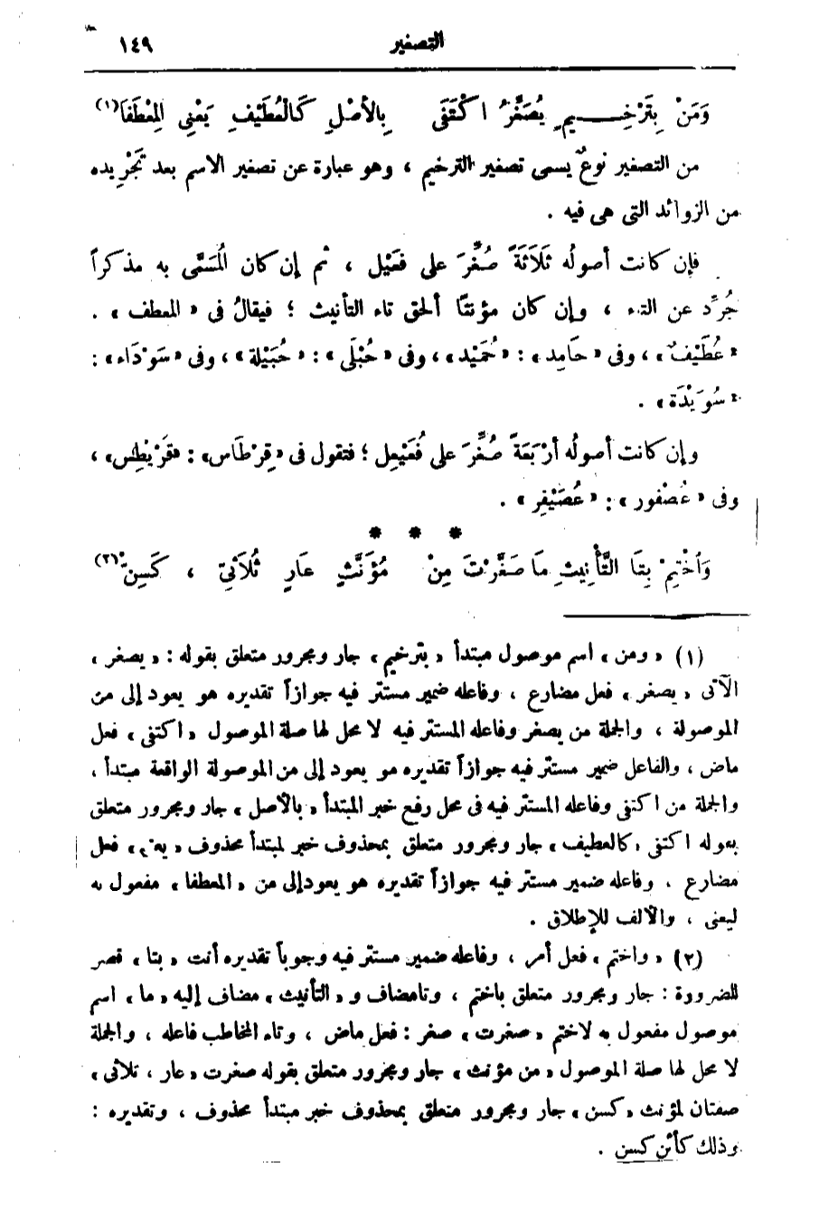 من التصغير نوع يسمى تصغير الترخيم: وهو عبارة عن تصغير الاسم بعد تجريده من الزوائد التي هي فيه فإن كانت أصوله ثلاثة صغر على فعيل ثم إن كان المسمى به مذكرا جرد عن التاء وإن كان مؤنثا ألحق تاء التأنيث فيقال في المعطف عطيف وفي حامد حميد وفي حبلى حبيلة وفي سوداء سويدة وإن كانت أصوله أربعة صغر على فعيعل فتقول في قرطاس قريطس وفي عصفور عصيفر.