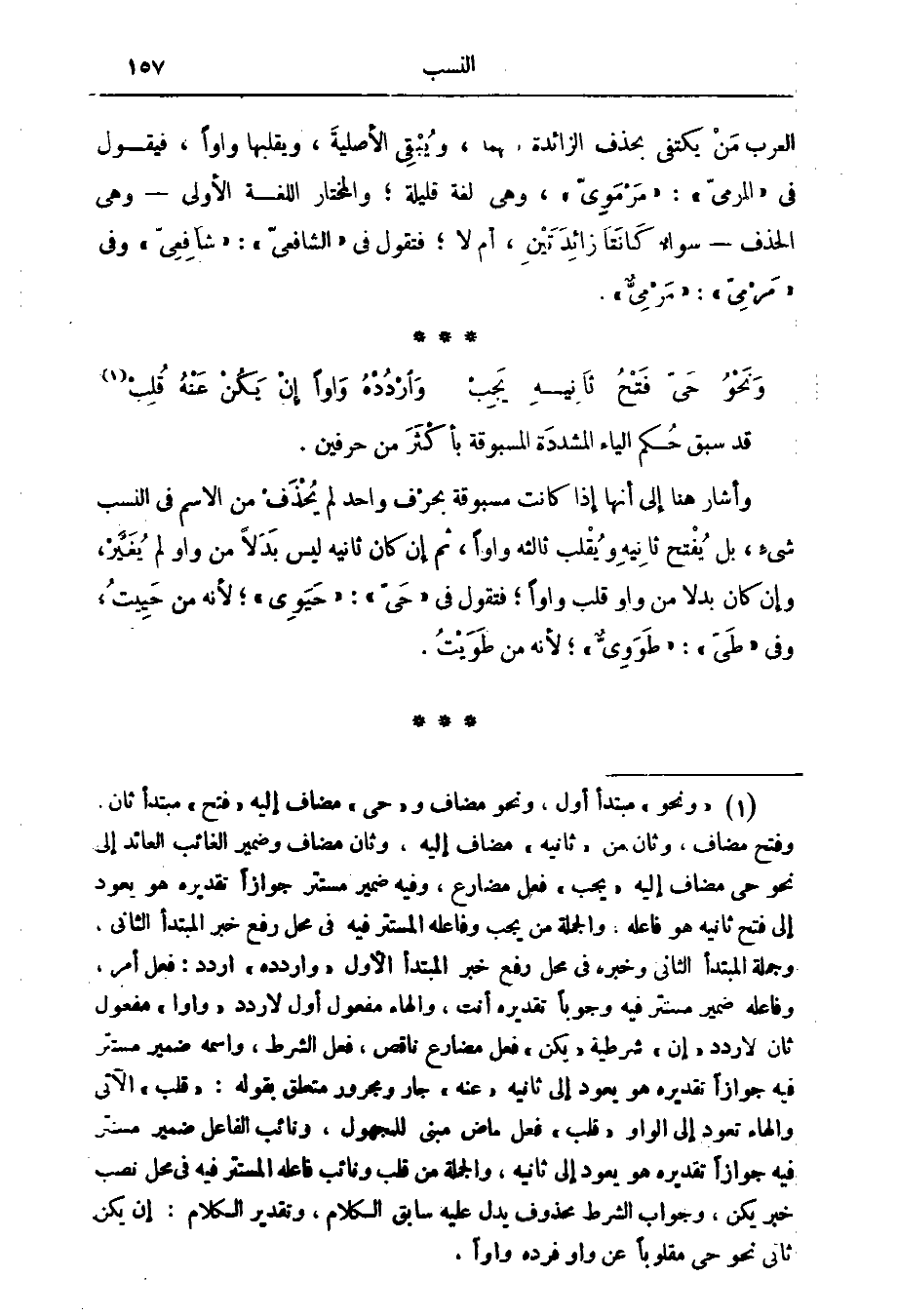وأشار هنا إلى أنها إذا كانت مسبوقة بحرف واحد لم يحذف من الاسم في النسب شيء بل يفتح ثانيه ويقلب ثالثه واوا ثم إن كان ثانيه ليس بدلا من واو لم يغير وإن كان بدلا من واو قلب واوا فتقول في حى حيوى لأنه من حييت وفي طى طووى لأنه من طويت.