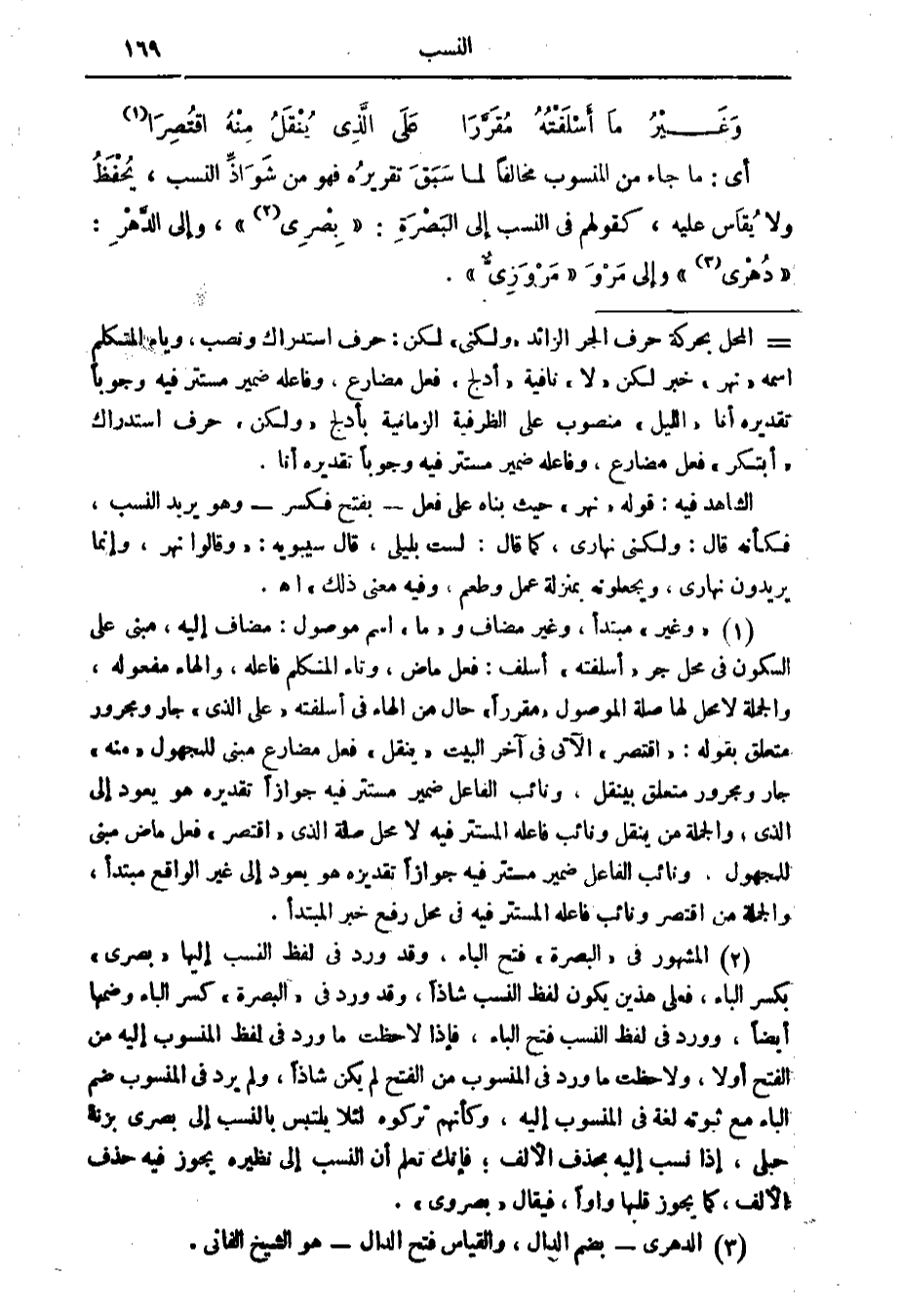 أي ما جاء من المنسوب مخالفا لما سبق تقريره فهو من شواذ النسب يحفظ ولا يقاس عليه كقولهم في النسب إلى البصرة بصرى وإلى الدهر دهرى وإلى مرو مروزى.
