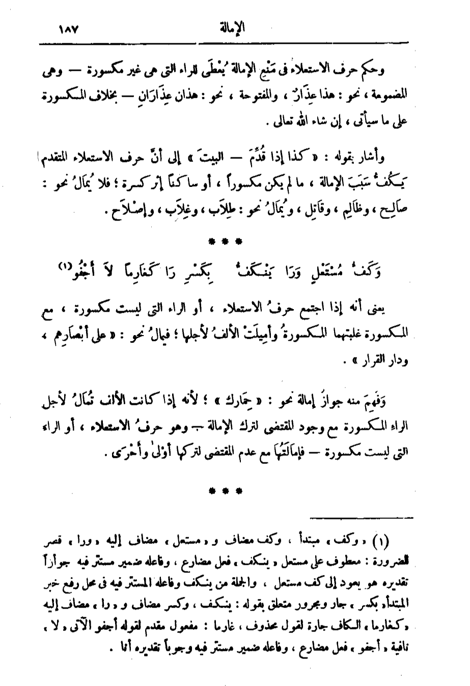 وفهم منه جواز إمالة نحو حمارك لأنه إذا كانت الألف تمال لأجل الراء المكسورة مع وجود المقتضى لترك الإمالة وهو حرف الاستعلاء أو الراء التي ليست مكسورة فإمالتها مع عدم المقتضى لتركها أولى وأحرى.