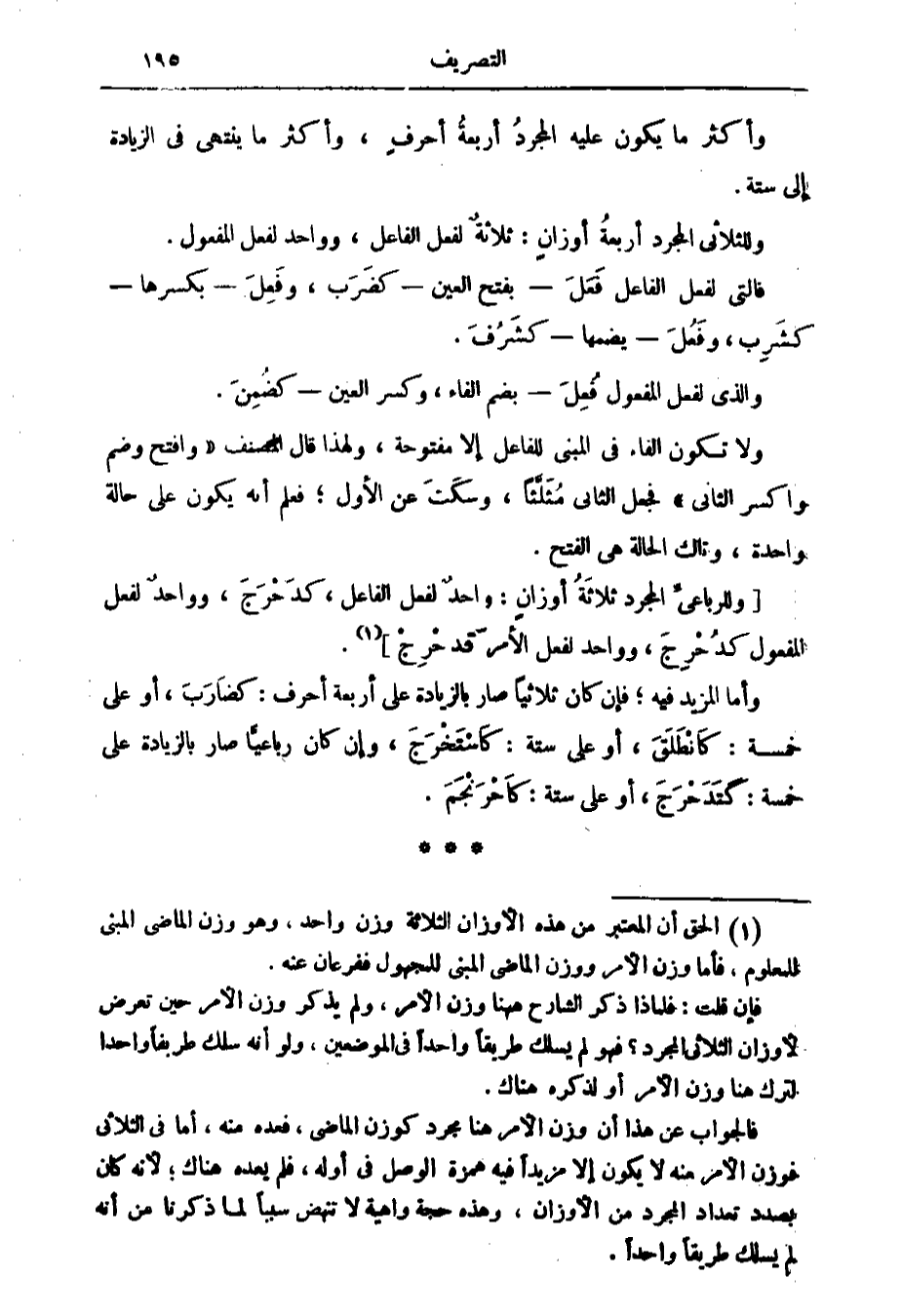 وأكثر ما يكون عليه المجرد أربعة أحرف وأكثر ما ينتهي في الزيادة إلى ستة وللثلاثي المجرد أربعة أوزان ثلاثة لفعل الفاعل وواحد لفعل المفعول فالتي لفعل الفاعل فعل بفتح العين كضرب وفعل بكسرها كشرب وفعل يضمها كشرف.