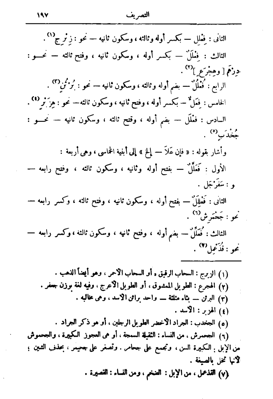 السادس: فعلل بضم أوله وفتح ثالثه وسكون ثانيه نحو جخدب.