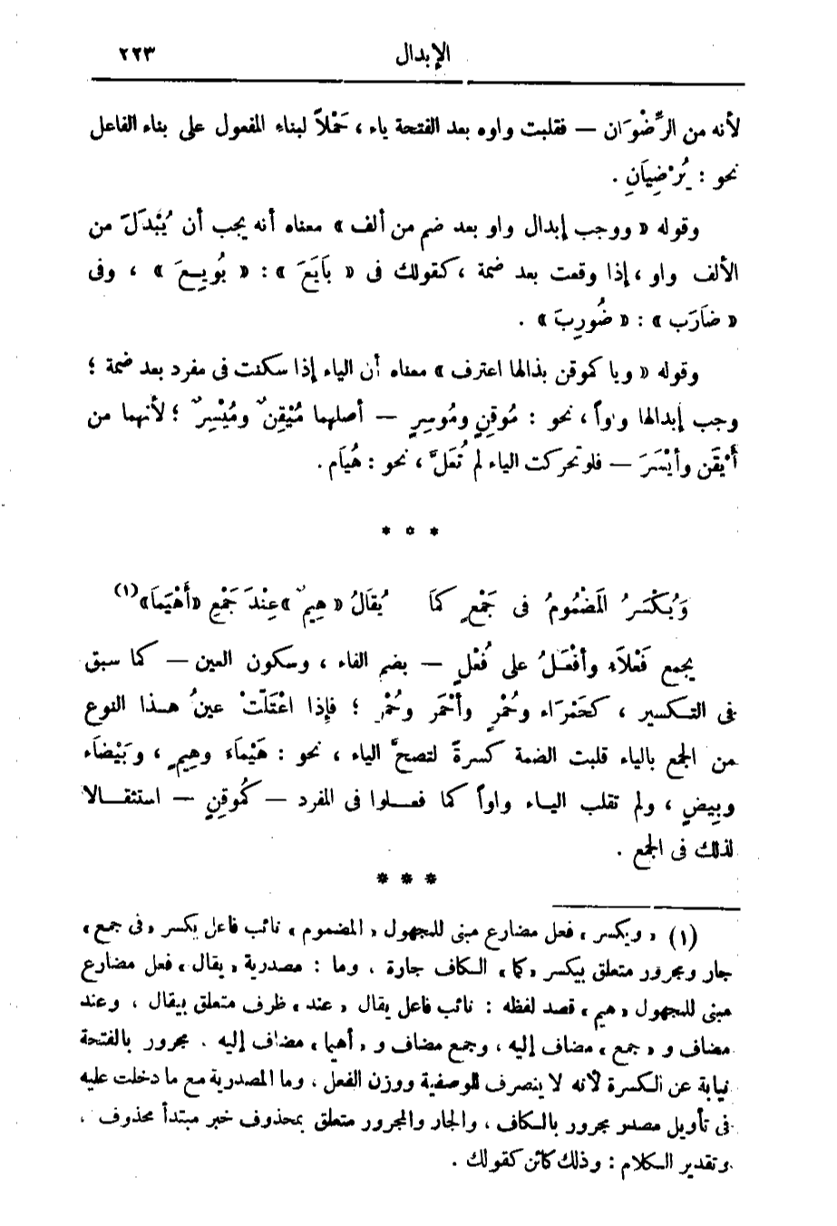 يجمع فعلاء وأفعل على فعل بضم الفاء وسكون العين كما سبق في التكسير كحمراء وحمر وأحمر وحمر فإذا اعتلت عين هذا النوع من الجمع بالياء قلبت الضمة كسرة لتصح الياء نحو هيماء وهيم وبيضاء وبيض ولم تقلب الياء واوا كما فعلوا في المفرد كموقن استثقالا لذلك في الجمع.