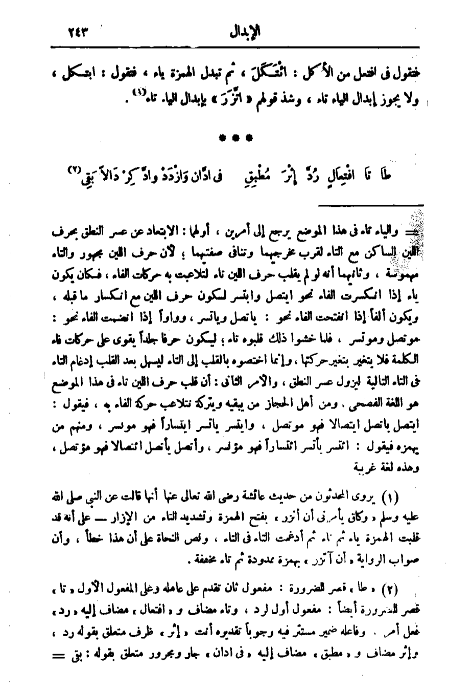 فتقول في افتعل من الأكل ائتكل ثم تبدل الهمزة ياء فتقول ابتكل ولا يجوز إبدال الياء تاء وشذ قولهم اتزر بإبدال الياء تاء.