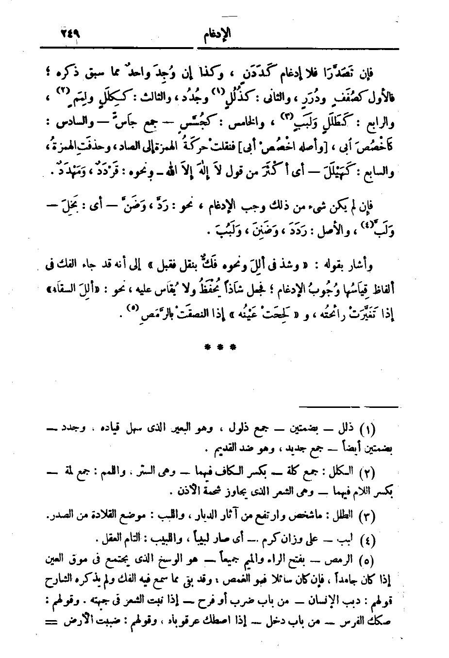 فإن تصدرا فلا إدغام كددن وكذا إن وجد واحد مما سبق ذكره فالأول كصفف ودرر والثاني كذلل وجدد والثالث ككلل ولمم والرابع كطلل ولبب والخامس كجسس جمع جاس والسادس كاخصص أبي وأصله اخصص أبي فنقلت حركة الهمزة إلى الصاد وحذفت الهمزة والسابع كهيلل أي أكثر من قول لا إله إلا الله ونحوه قردد ومهدد.