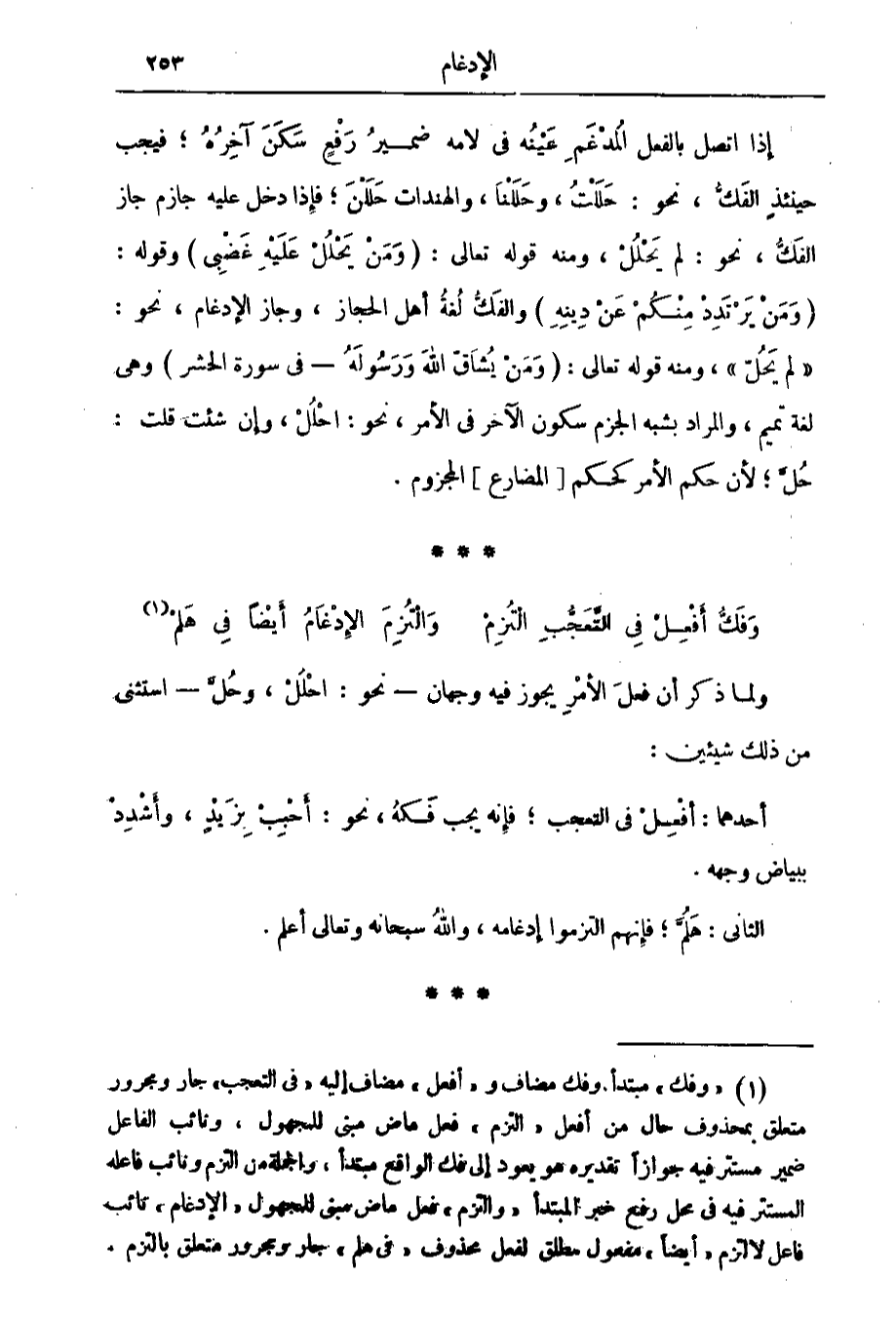 إذا اتصل بالفعل المدغم عينه في لامه ضمير رفع سكن آخره فيجب حينئذ الفك نحو حللت وحللنا والهندات حللن فإذا دخل عليه جازم جاز الفك نحو لم يحلل ومنه قوله تعالى: {مَنْ يَحْلِلْ عَلَيْهِ غَضَبِي} وقوله: {وَمَنْ يَرْتَدِدْ مِنْكُمْ عَنْ دِينِهِ} والفك لغة أهل الحجاز وجاز الإدغام نحو لم يحل ومنه قوله تعالى: {وَمَنْ يُشَاقِّ اللهَ} في سورة الحشر وهي لغة تميم والمراد بشبه الجزم سكون الآخر في الأمر نحو احلل وإن شئت قلت حل لأن حكم
