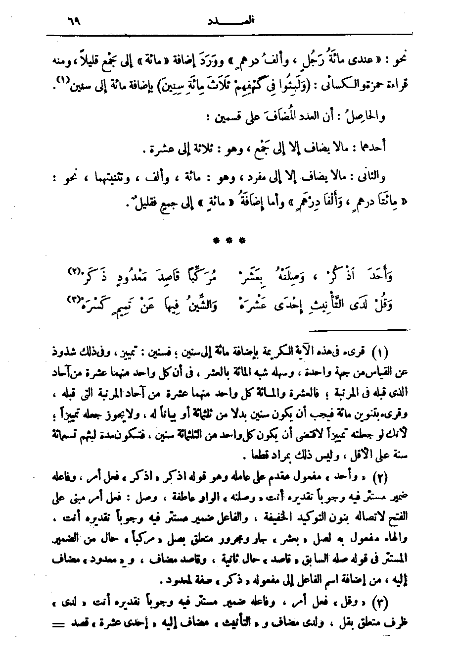 نحو عندي مائة رجل وألف درهم وورد إضافة مائة إلى جمع قليلا ومنه قراءة حمزة والكسائي: {وَلَبِثُوا فِي كَهْفِهِمْ ثَلاثَ مِائَةٍ سِنِينَ} .بإضافة مائة إلى سنين.