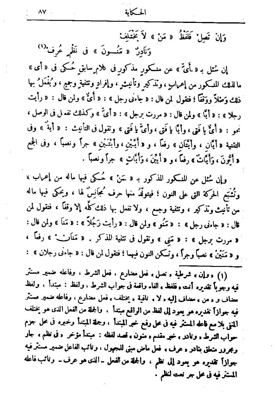 إن سئل ب أي عن منكور مذكور في كلام سابق حكى في أي ما لذلك المنكور من إعراب وتذكير وتأنيث وإفراد وتثنية وجمع ويفعل بها ذلك وصلا ووقفا فتقول لمن قال جاءني رجل أي ولمن قال رأيت رجلا أيا ولمن قال مررت برجل أي وكذلك تفعل في الوصل نحو أي يا فتى وأيا وأي يا فتى وتقول في التأنيث أية وفي التثنية أيان وأيتان رفعا وأيين وأبتين جرا ونصبا وفي الجمع أيون وأيات رفعا وأيين وأيات جرا ونصبا وإن سئل عن المنكور المذكور ب من حكى فيها ما له من إعراب وتشبع الحركة التي على النون فيتولد منها حرف مجانس لها ويحكى فيها ما له من تأنيث وتذكير وتثنية وجمع ولا تفعل بها ذلك كله إلا وقفا فتقول لمن قال جاءني رجل منو ولمن قال رأيت رجلا منا ولمن قال مررت برجل منى وتقول في تثنية المذكر منان رفعا ومنين نصبا وجرا وتسكن النون فيهما فتقول لمن قال جاءني