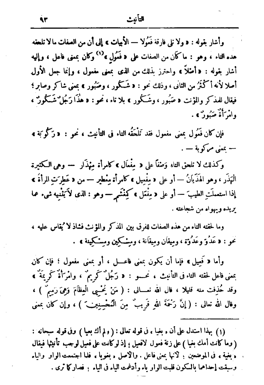 وأما فعيل فإما أن يكون بمعنى فاعل أو بمعنى مفعول فإن كان بمعنى فاعل لحقته التاء في التأنيث نحو رجل كريم وامرأة كريمة وقد حذفت منه قليلا قال الله تعالى: {مَنْ يُحْيِي الْعِظَامَ وَهِيَ رَمِيمٌ} وقال الله تعالى: {إِنَّ رَحْمَتَ اللهِ قَرِيبٌ مِنَ الْمُحْسِنِينَ} وإن كان بمعنى