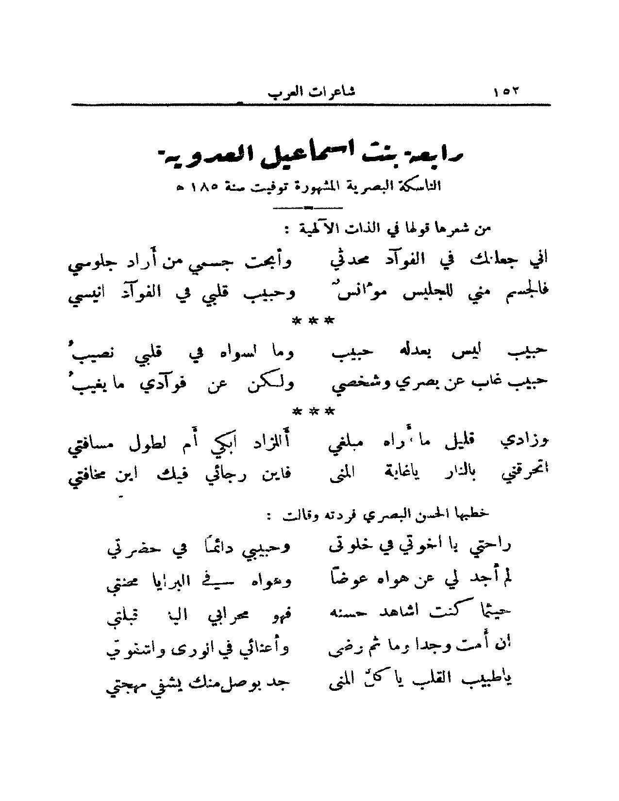 هي أم الخير, رابعة بنت إسماعيل العدوية امرأة صالحة من أهل البصرة اشتهرت بالعبادة والنسك. توفيت بالقدس 185 هجرية. من شعرها قولها في الذات الإلهية: