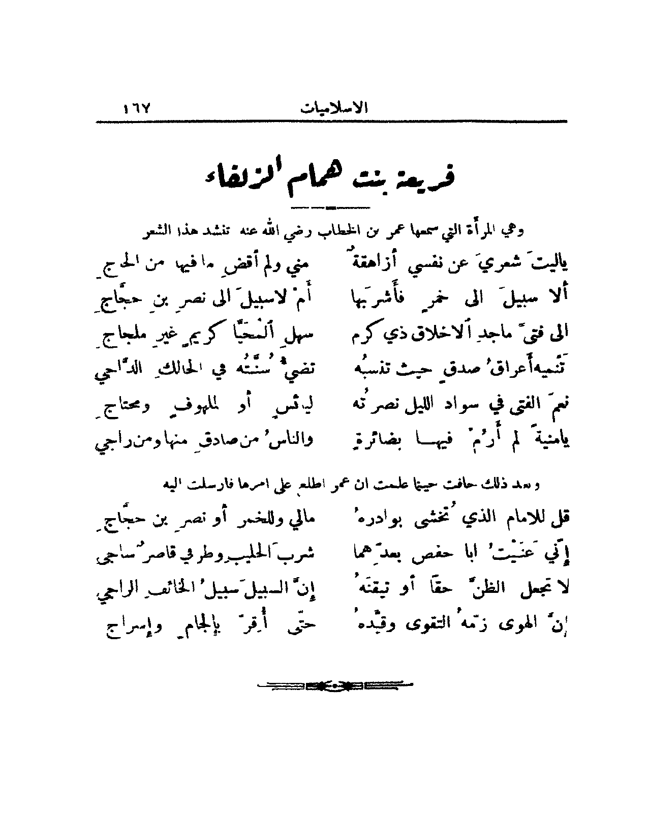 امرأة من المدينة اشتاقت إلى معاقرة الخمرة مع نصر بن حجاج هو شاعر جميل الصورة أغرمت به بعض النساء عصره فقص شعر رأسه ونفي إلى البصرة.