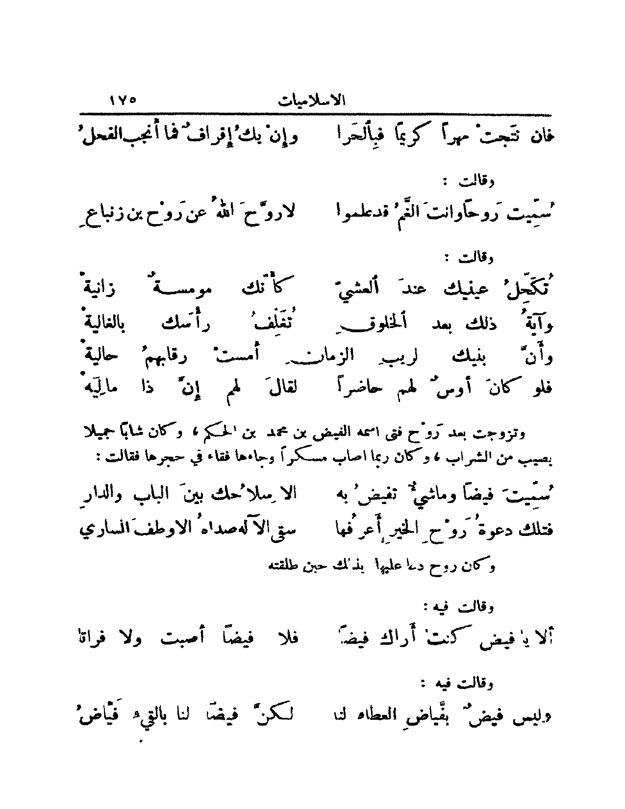 وتزوجت بعد روحٍ فتى اسمه الفيض بن محمد بن الحكم, وكان شاباً جميل الصورة له ولع بالشراب. وقد قاء مرةً في جحرها فقالت: (من البسيط)