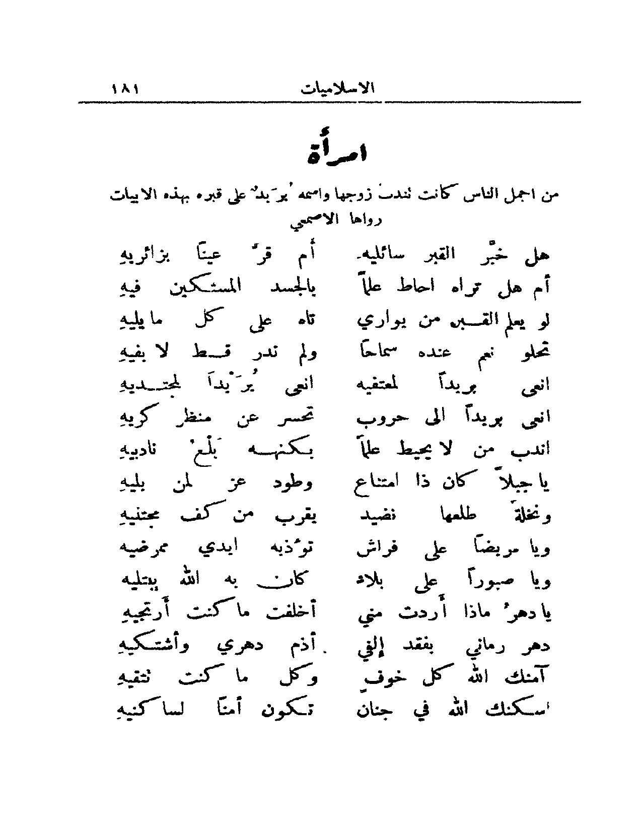 كانت امرأة من أجمل النساء, مات عنها زوجها بريد, فكانت تقف على قبره وتندبه بهذه الأبيات كما رواها الأصمعي: (من مخلع البسيط)