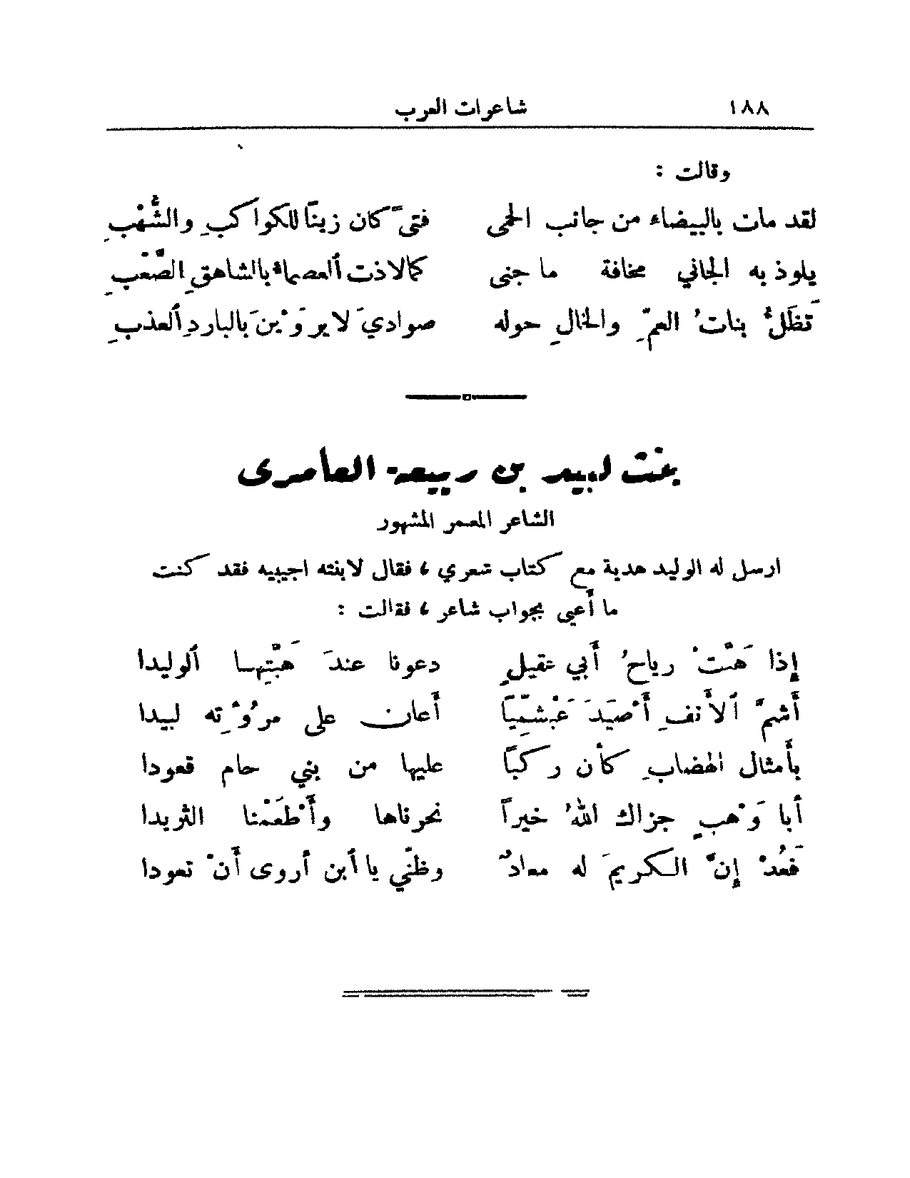 أرسل الوليد بن عقبة أبو وهب الأموي القرشي وكان والي عثمان على الكوفة, إلى لبيدٍ العامرية هدية فيها ناقة, مع كتاب شعري, فقال لبيد لابنته أجيبيه, فقد كنت ما أعيى بجواب شاعرٍ, فقالت: (من الوافر)