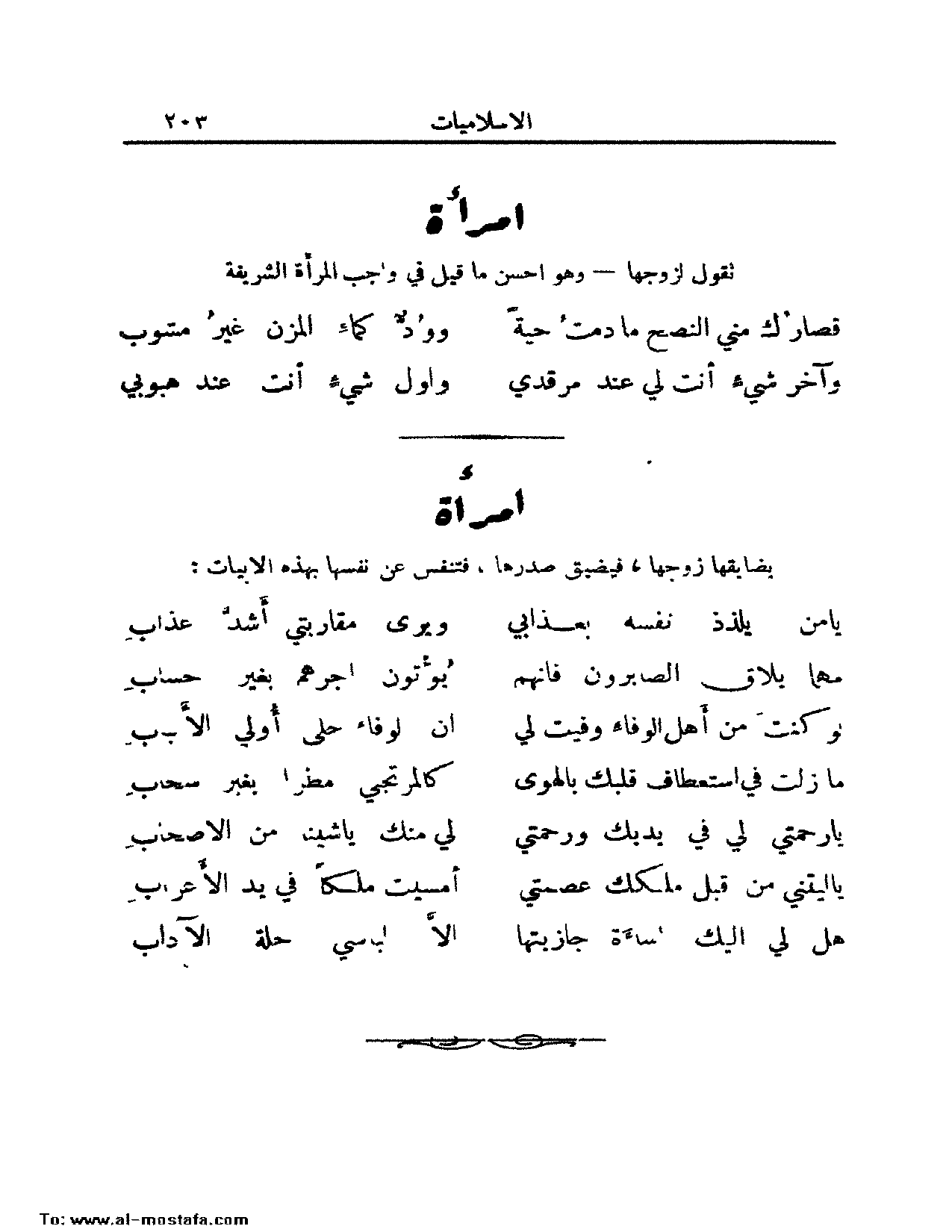 تقول لزوجها- وهو أحسن ما قيل في واجب المرأة الشريفة: (من الطويل)