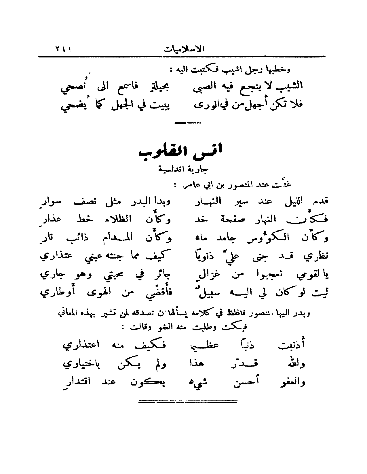 سألها مولاها المنصور لمن تشير بهذه المعاني واشتد عليها وأغلظ في كلامه فبكت وطلبت منه العفو وقالت: (من المجتث)