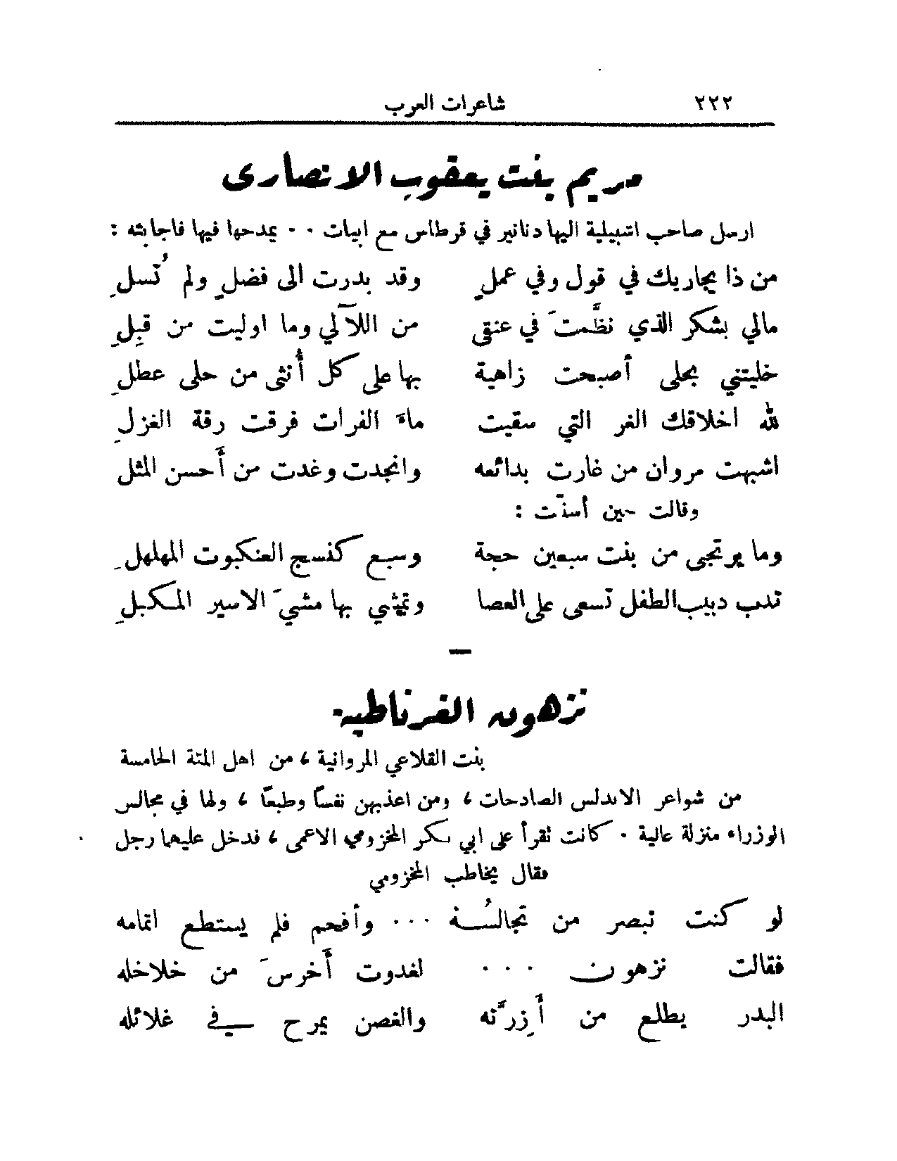 [قال الراوي] فأفحم ولم يستطع إتمامه, فأتمته نزهون قائلةً: (من الكامل)