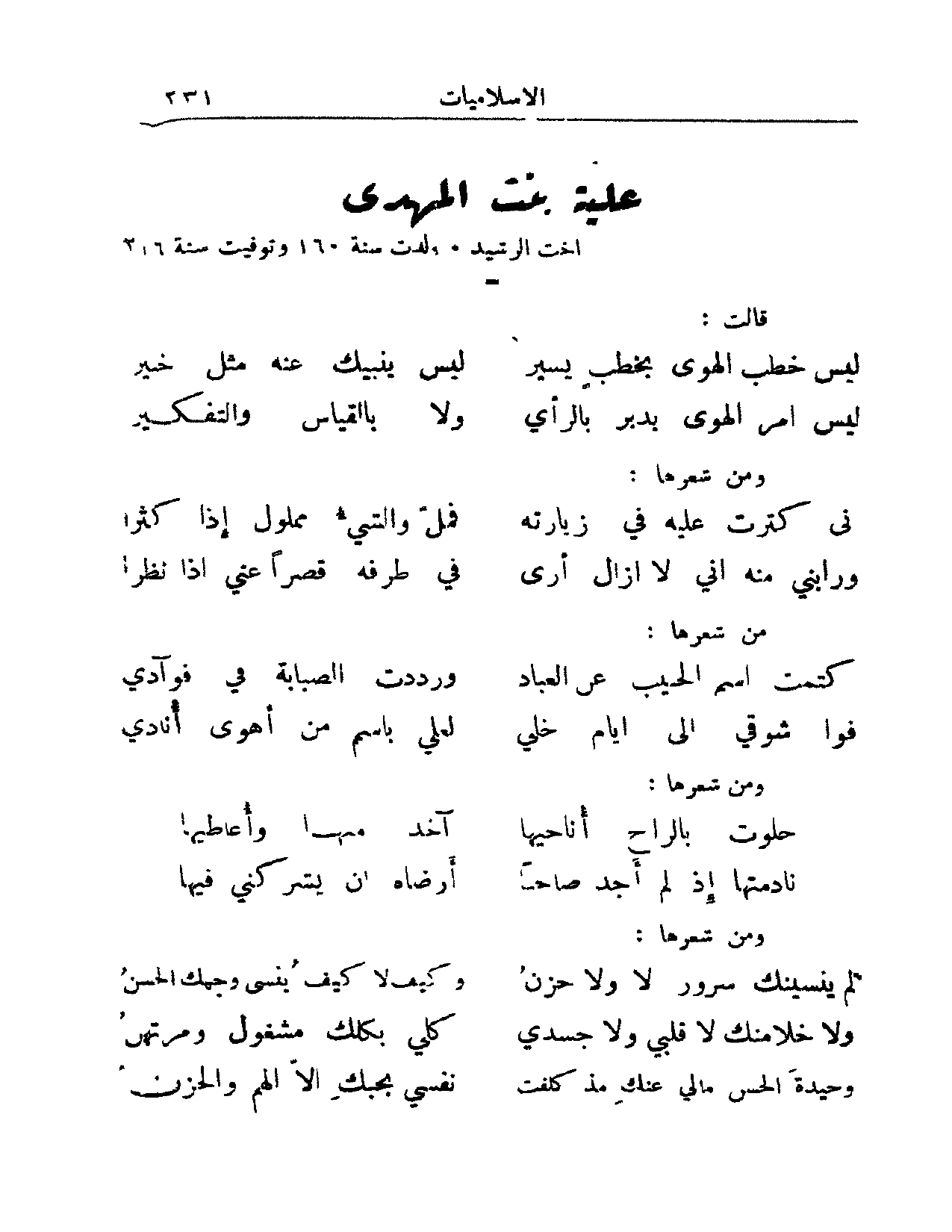 هي علية بنت المهدي بن المنصور, أخت هارون الرشيد. شاعرة تحسن صناعة الغناء وكان أخوها إبراهيم بن المهدي يأخذ الغناء عنها. قسمت وقتها بين عبادةٍ وسماع الغناء. لقبها العباسة وأشيع أنها كانت على علاقة مع جعفر بن يحيى البرمكي وزير أخيها مما لم يثبت قطعاً. لها ديوان شعر, وكانت وفاتها ببغداد عام 210 هجرية. وذكر كتابنا (شاعرات العرب) أن مولدها كان 160 هجرية ووفاتها كانت 216 هجرية.