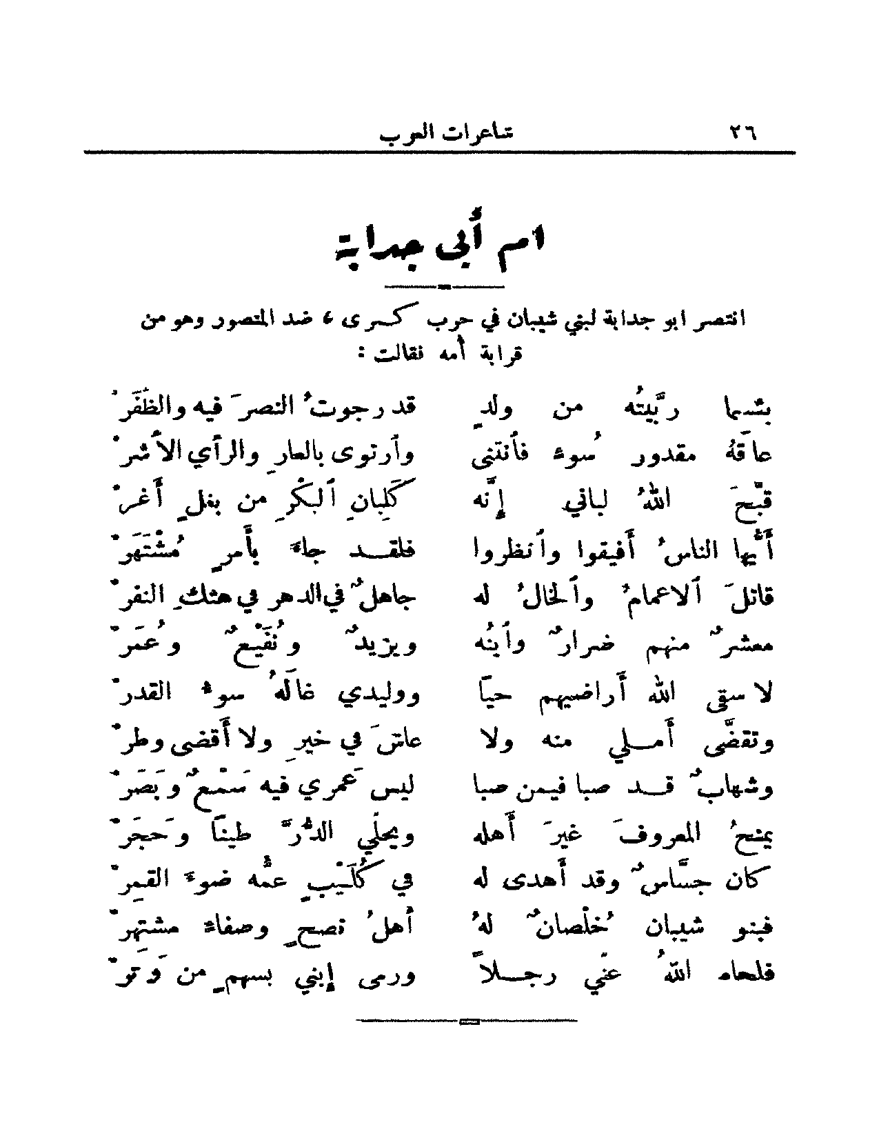كان أبو جدابة الشيباني قد انتصر لبني شيبان في حربهم مع كسرى, ووقف ضد المنصور قائد جيش كسرى وهوى من أقاربها, فأغضبها من ولدها هذا الموقف, فقالت: (من الرمل)