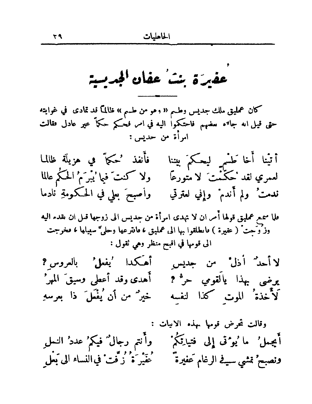 فلما سمع عمليق قولها أمر أن لا تهدى امرأة من جديس إلى زوجها قبل أن تقدم إليه.