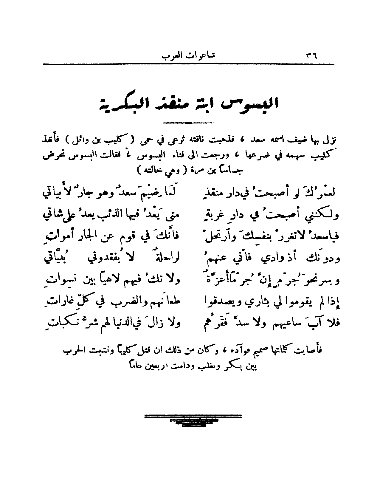 فأصابت كلماتها فؤاده, وكان من ذلك أن قتل كليباً ونشبت الحرب بين بكر ودامت أربعين عاماً.