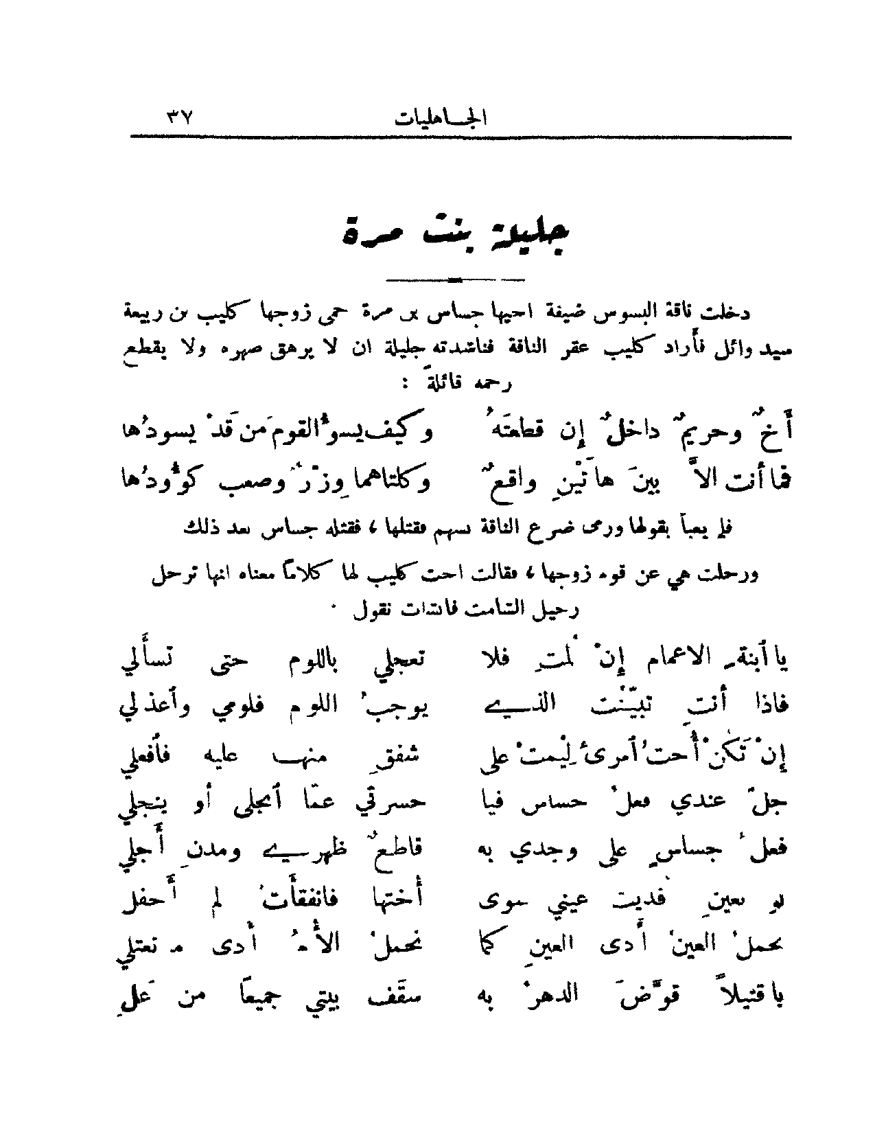 المناسبة لم يعبأ كليب بتحذير زوجته جليلة, ورمى ضرع ناقة خالتها البسوس, فقتله أخوها بها, ورحلت هي عن قوم زوجها, فقالت لها أخت كليب كلاماً مضمونه أنها ترحل رحيل الشامت فقالت تجيبها (من الرمل)
