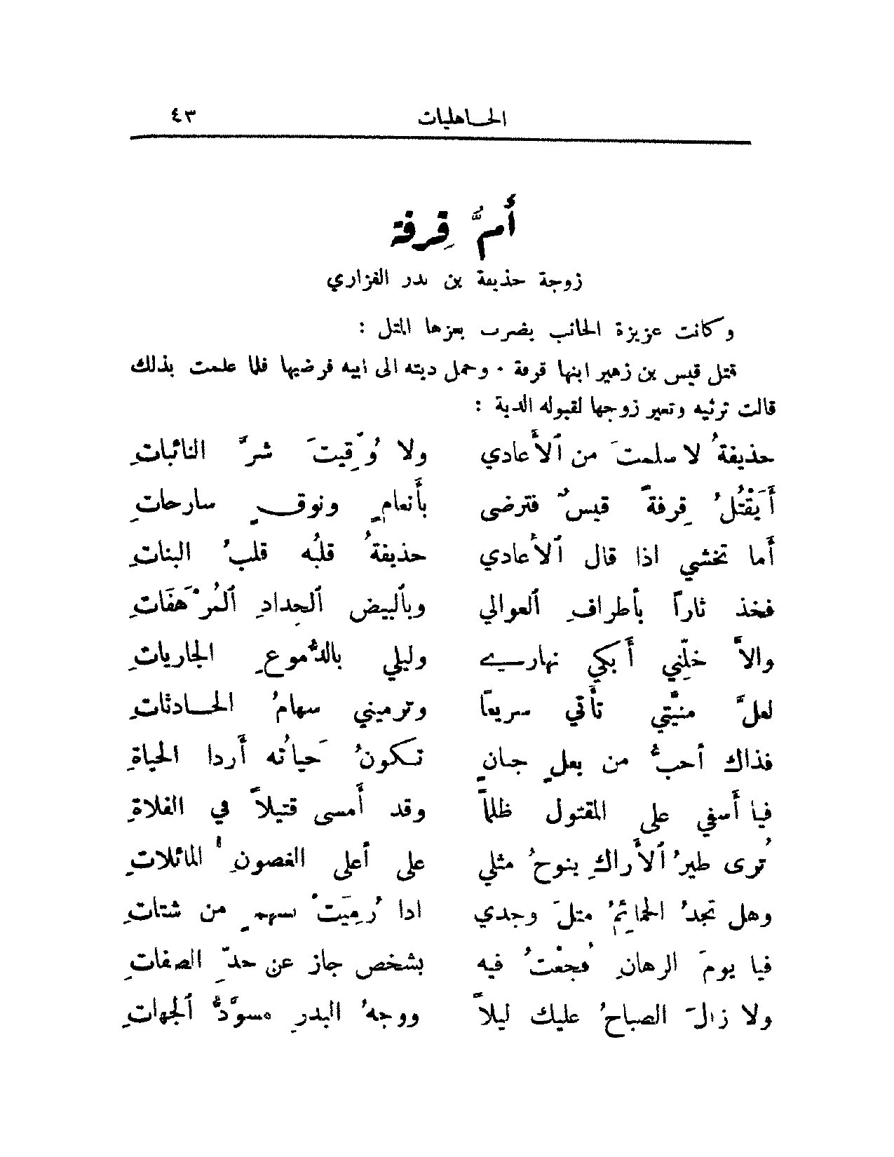 لما علمت أم قرفة بأن زوجها حذيفة بن بدر قد قبل دية ولدها قرفة من قاتلة ساءها ذلك فقالت ترثيه وتعير زوجها لقبوله الدية: (من الوافر)
